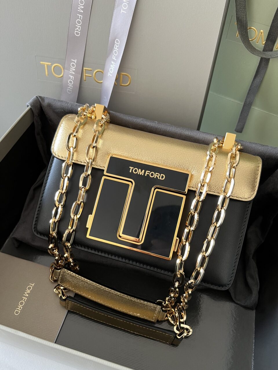 Tom Ford Laminated Calf Shoulder Bag in Black and Gold