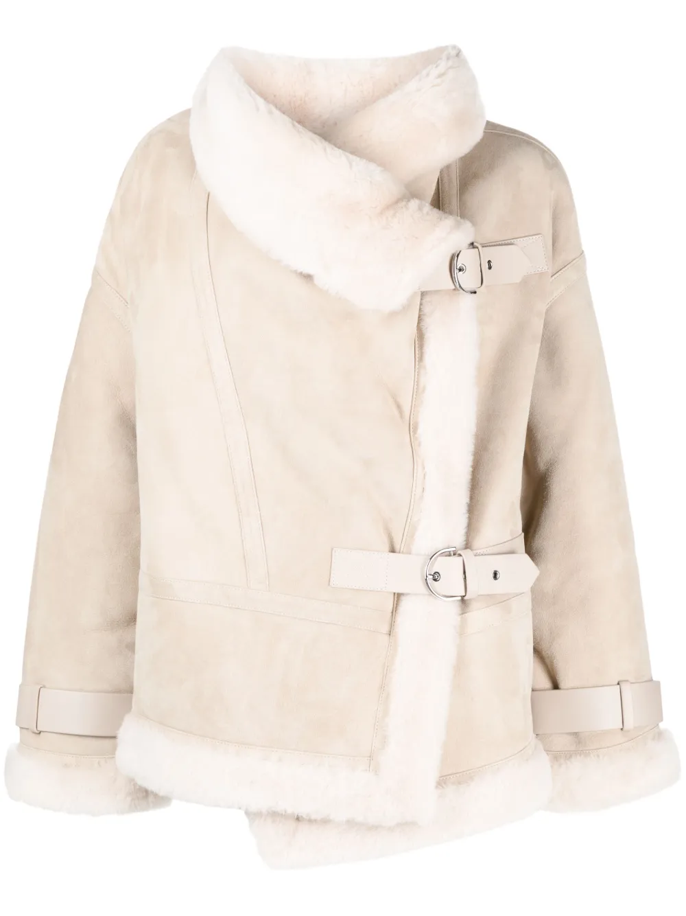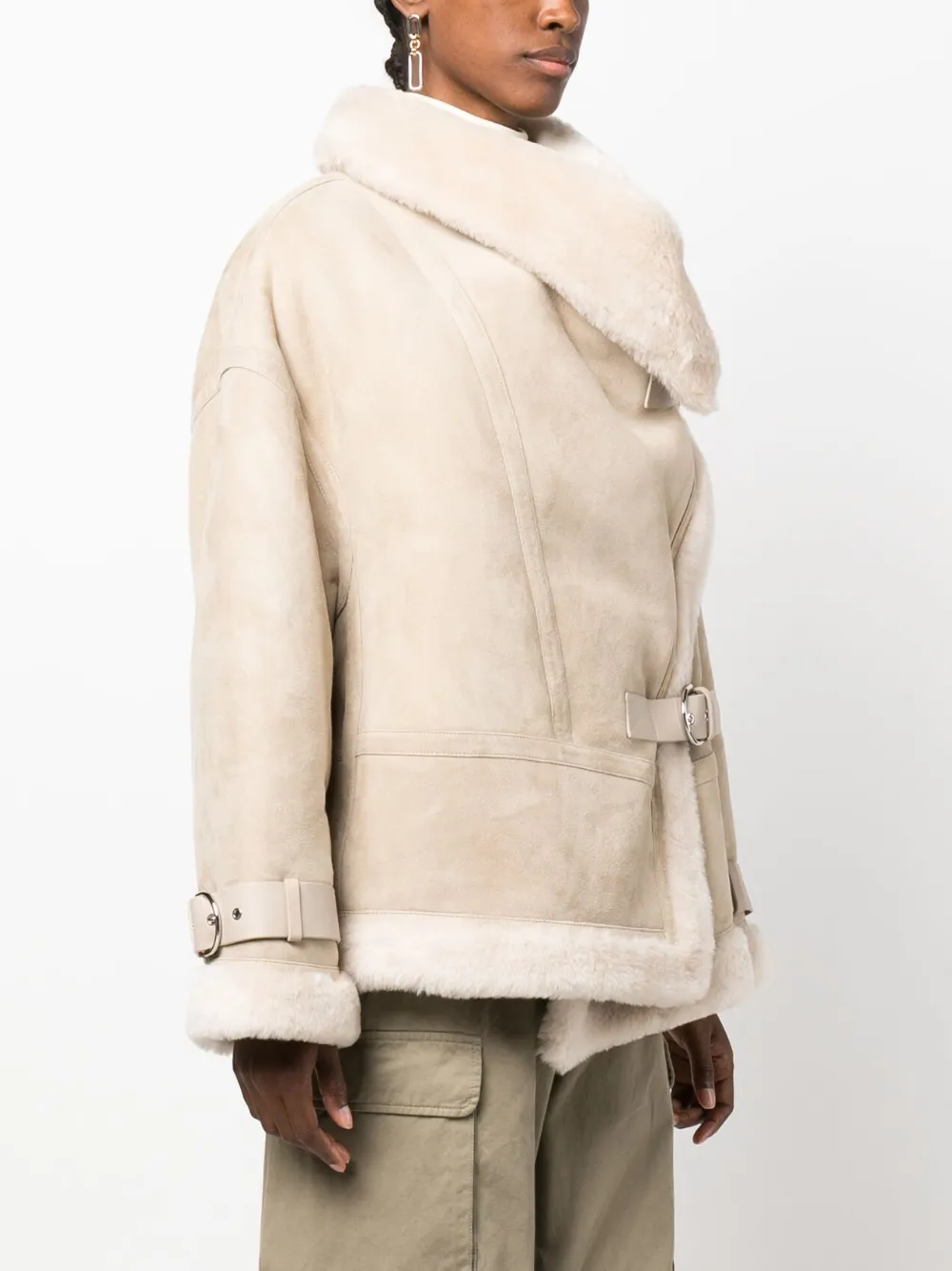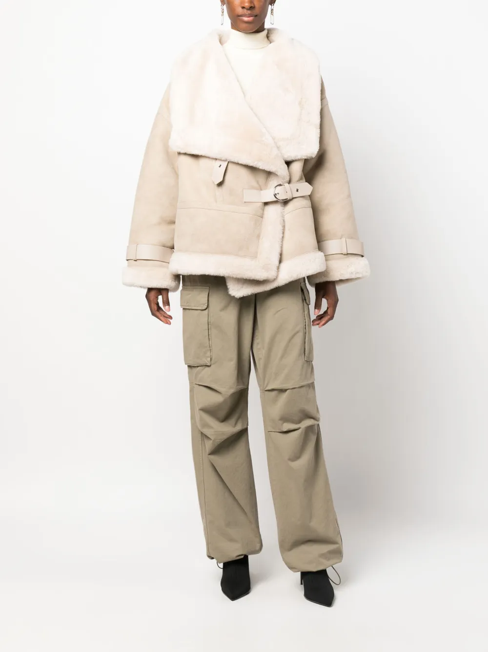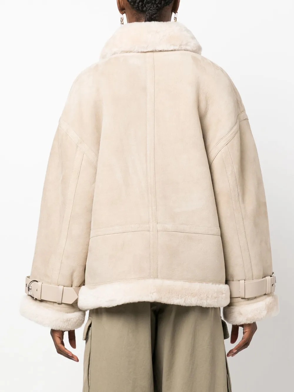 Exposed shearling trims at hem, cuffs, and collar edges