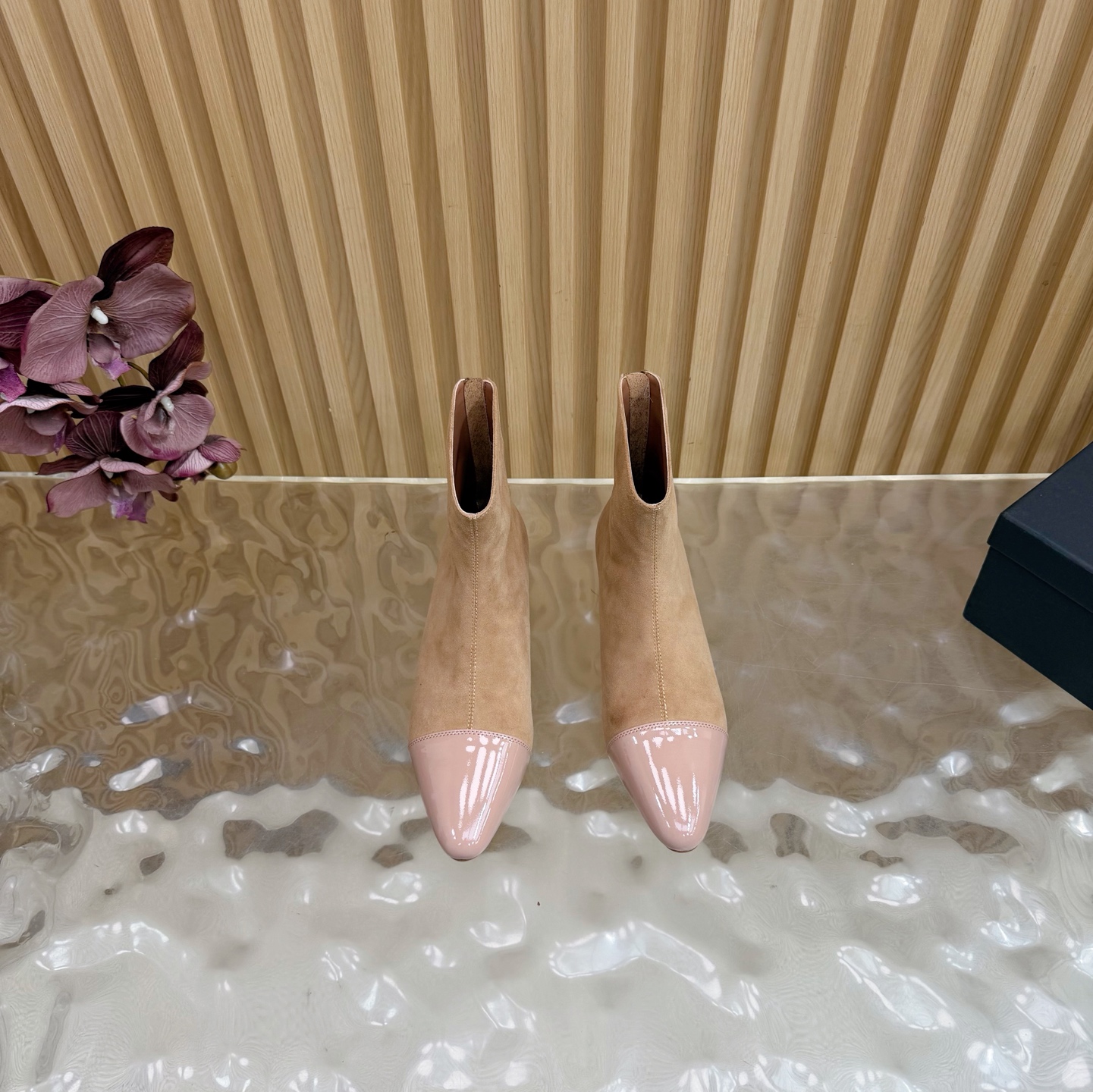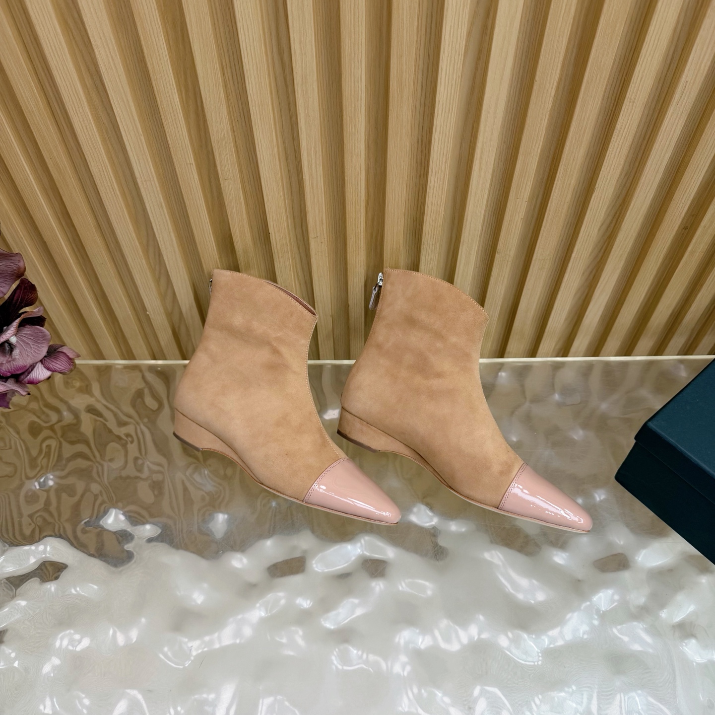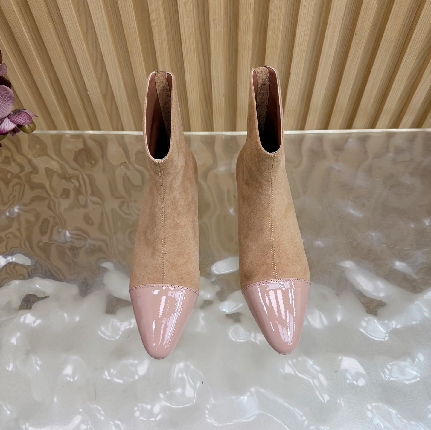 Contrasting blush patent leather cap toe, adding a polished, modern accent