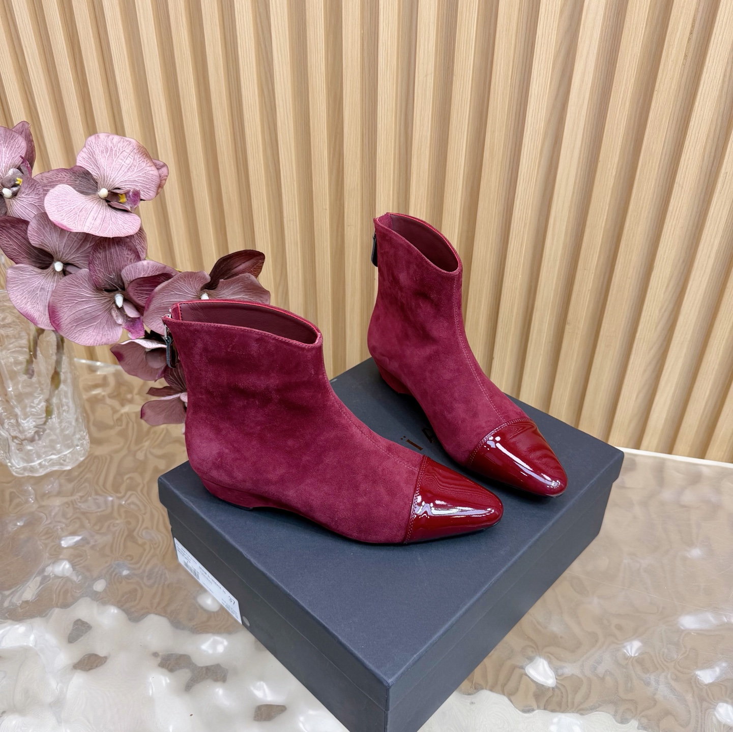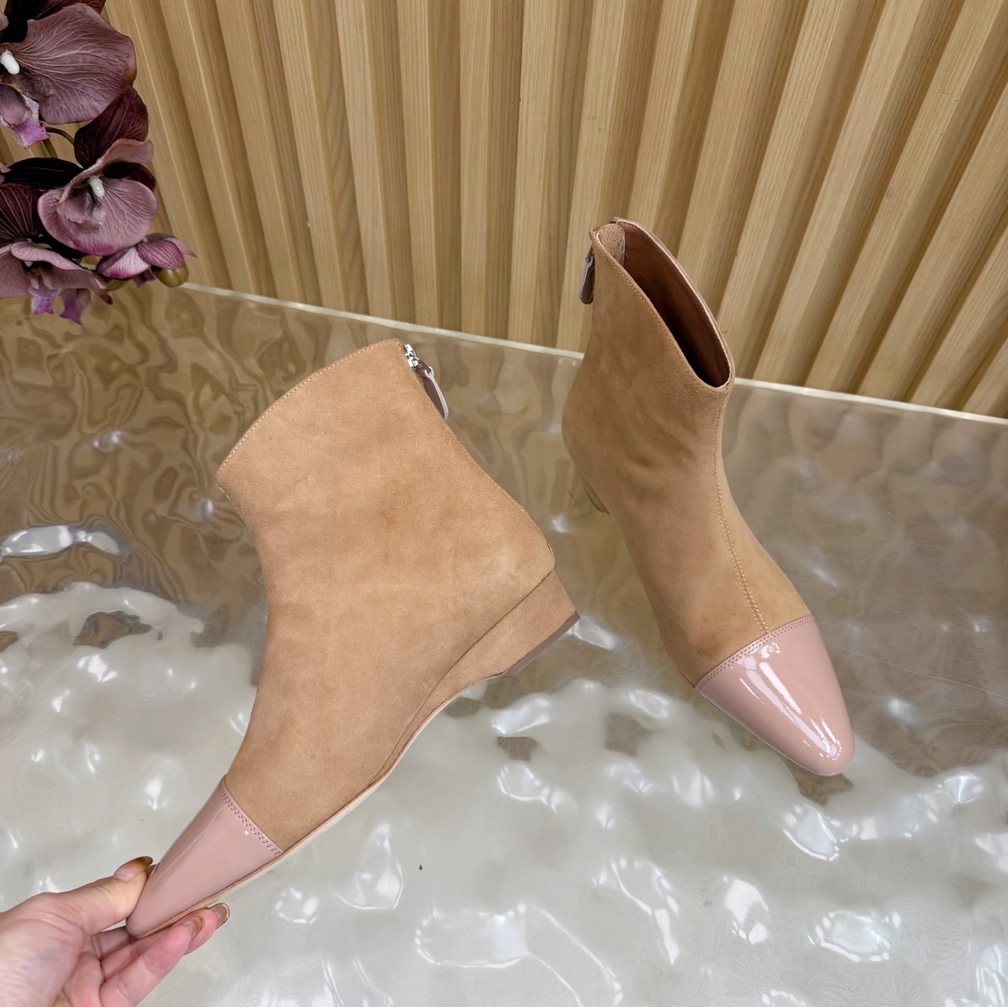 ALAÏA Suede Ankle Boots with Patent Cap Toe