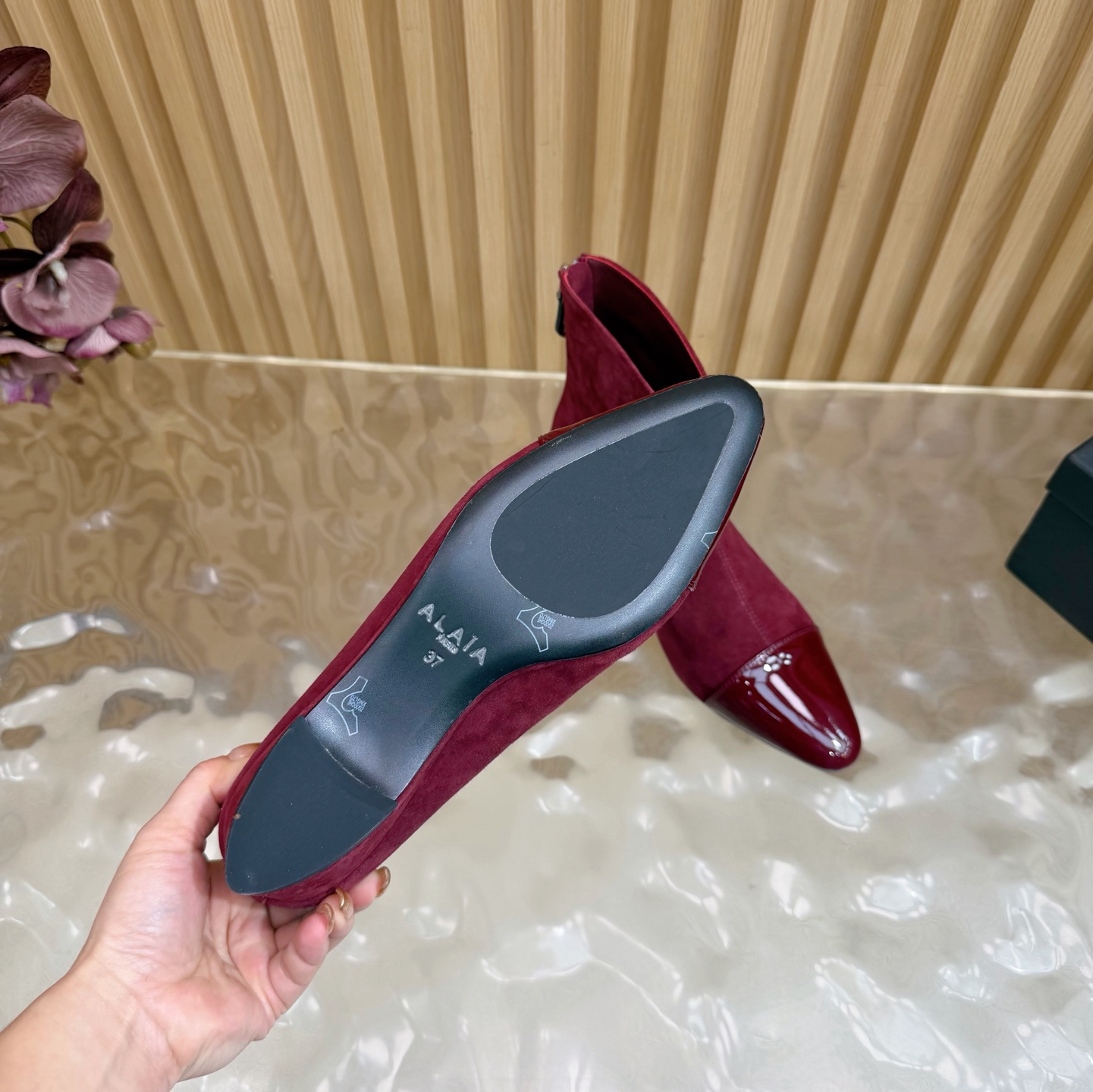 Distinctive pointed-round hybrid toe shape, typical of Alaïa’s architectural aesthetic