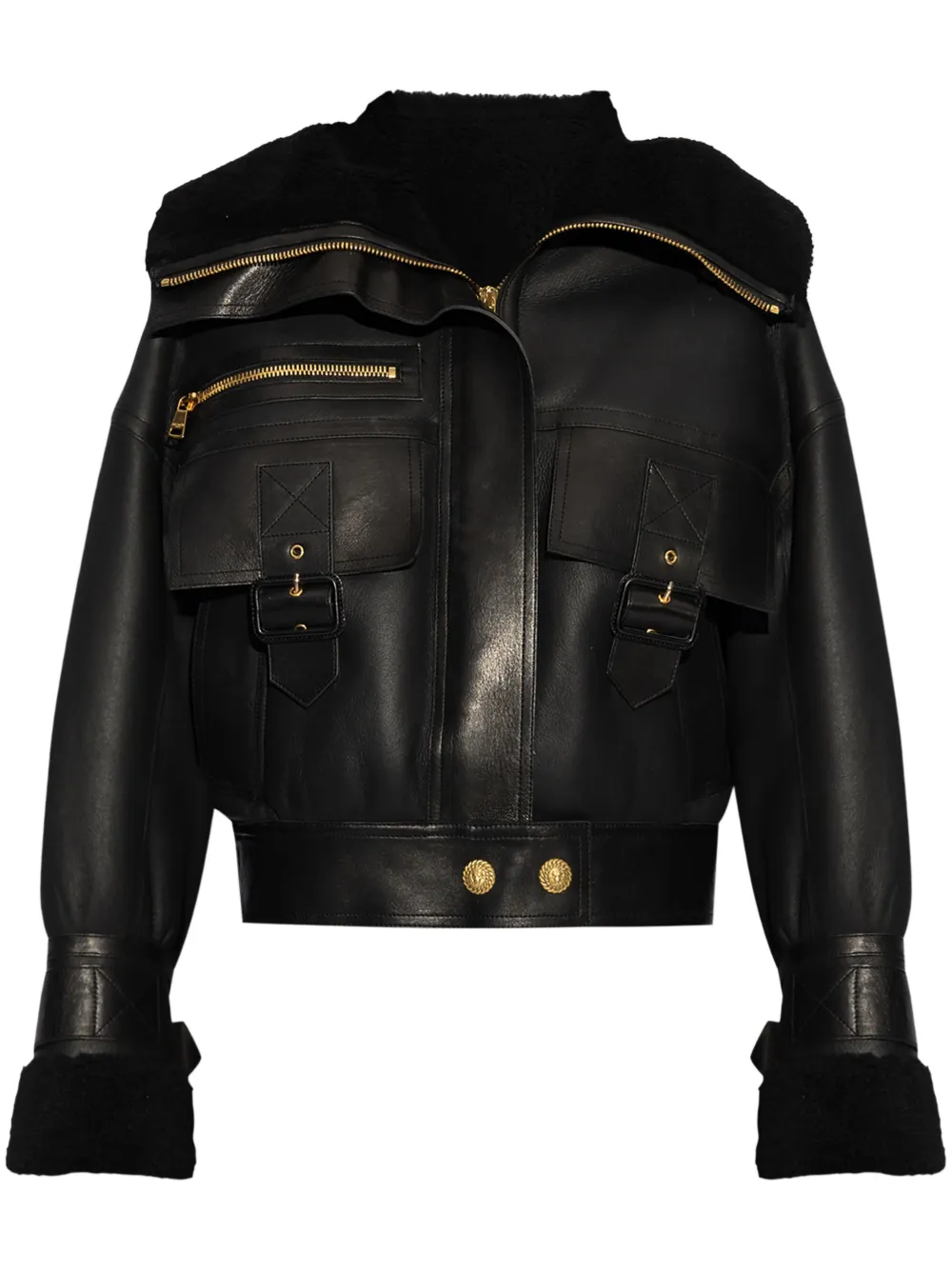 Balmain Shearling-Lined Leather Aviator Jacket in Black