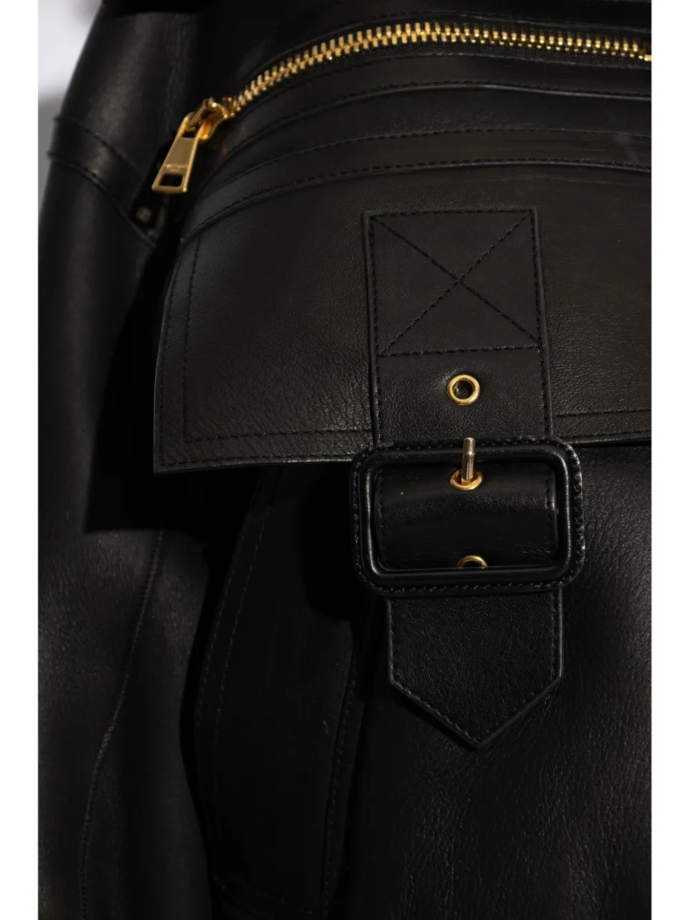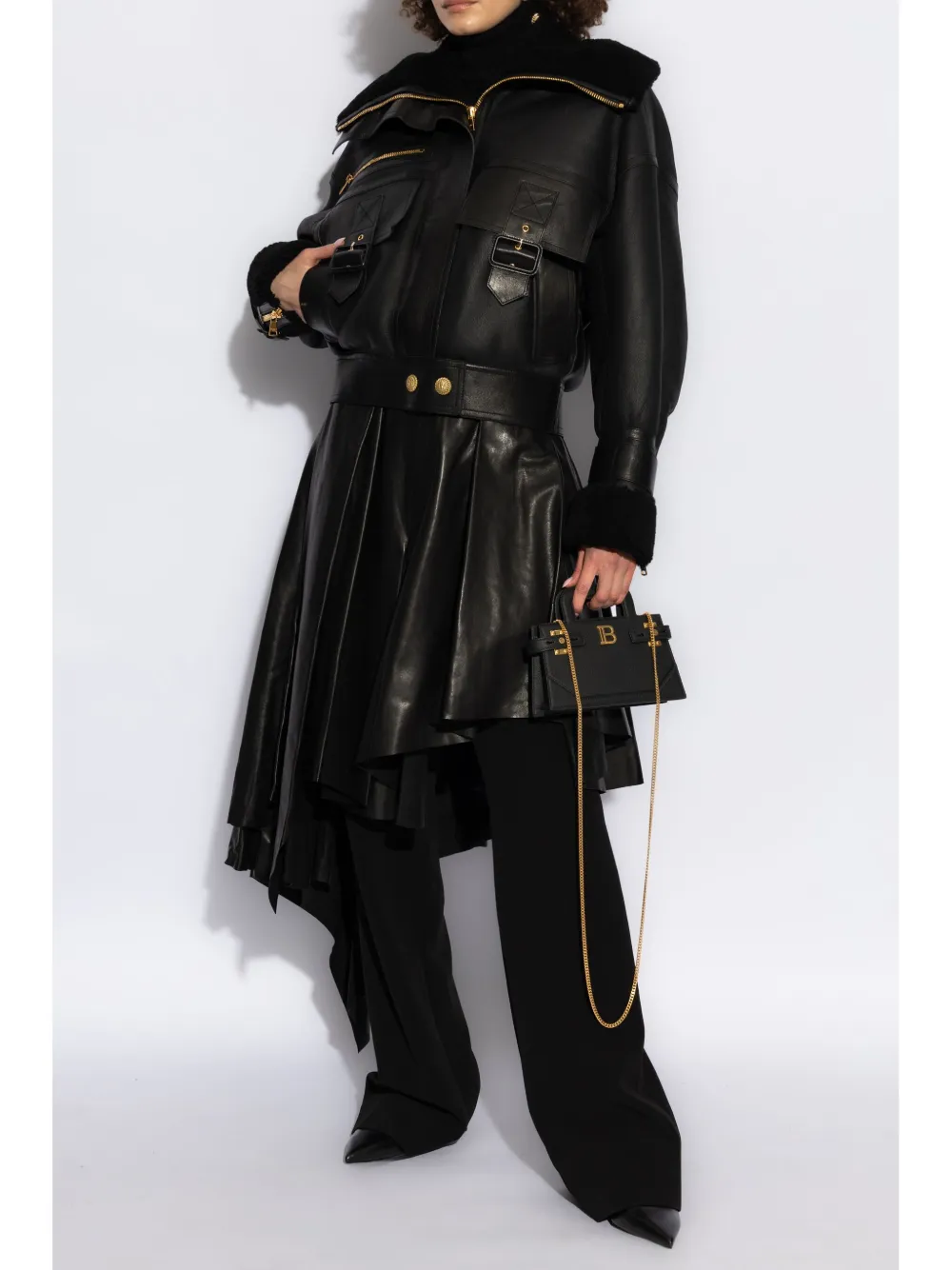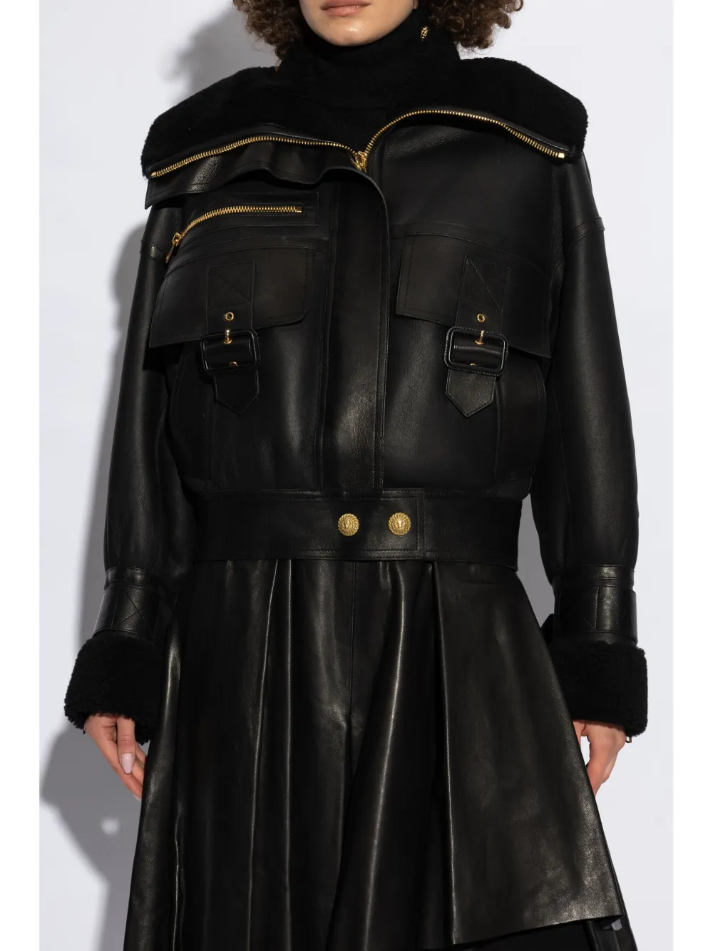 Wide shearling collar with exposed gold zipper detailing