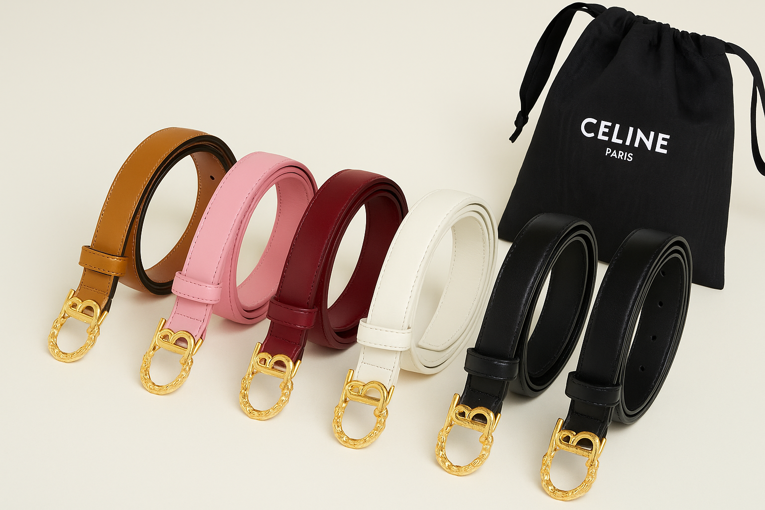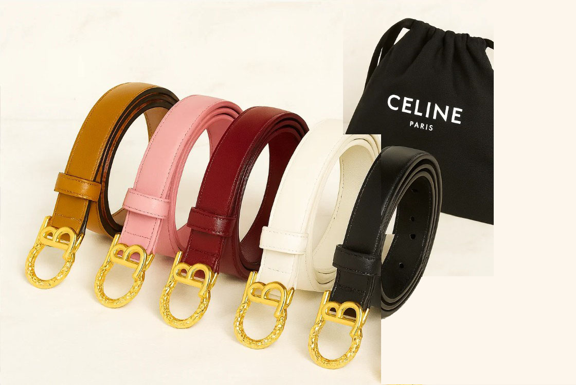 - Signature Celine “B” buckle with textured loop detail