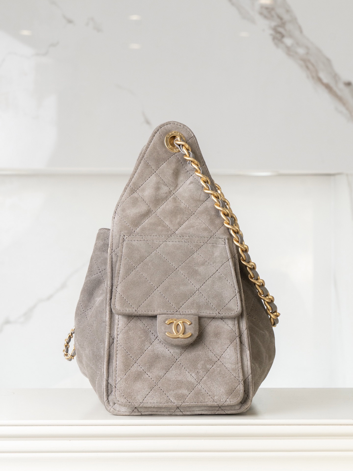 - Hardware: Gold-tone CC turn-lock & chain details