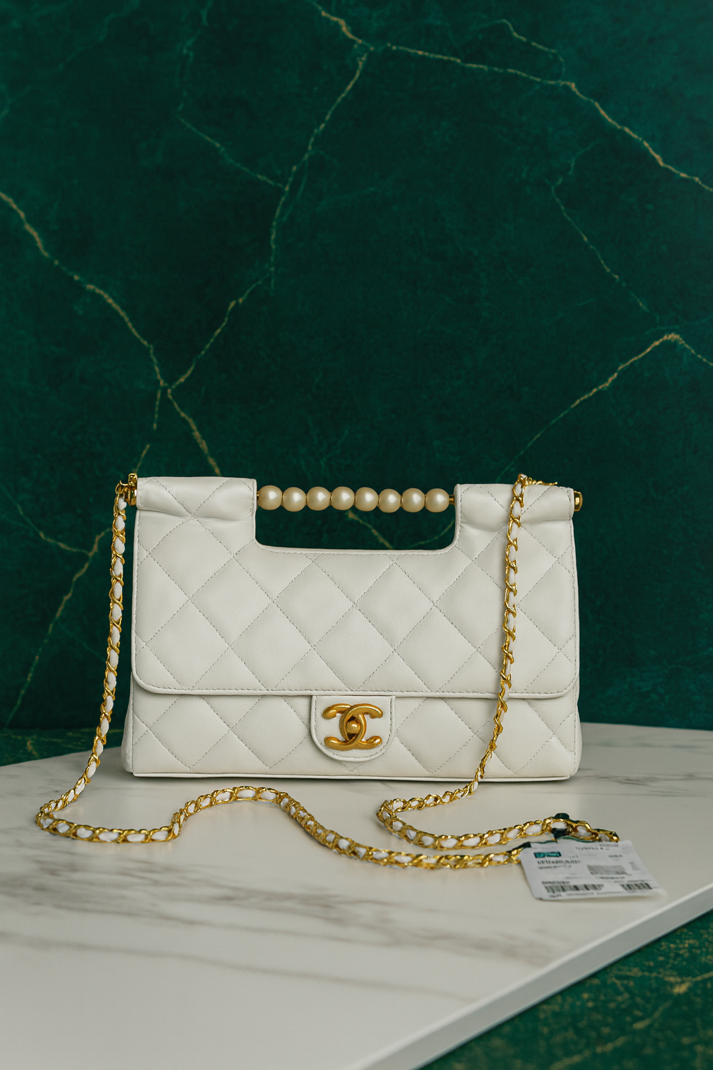 - Detail: Iconic CC turn-lock with a single strand of pearls as the top handle