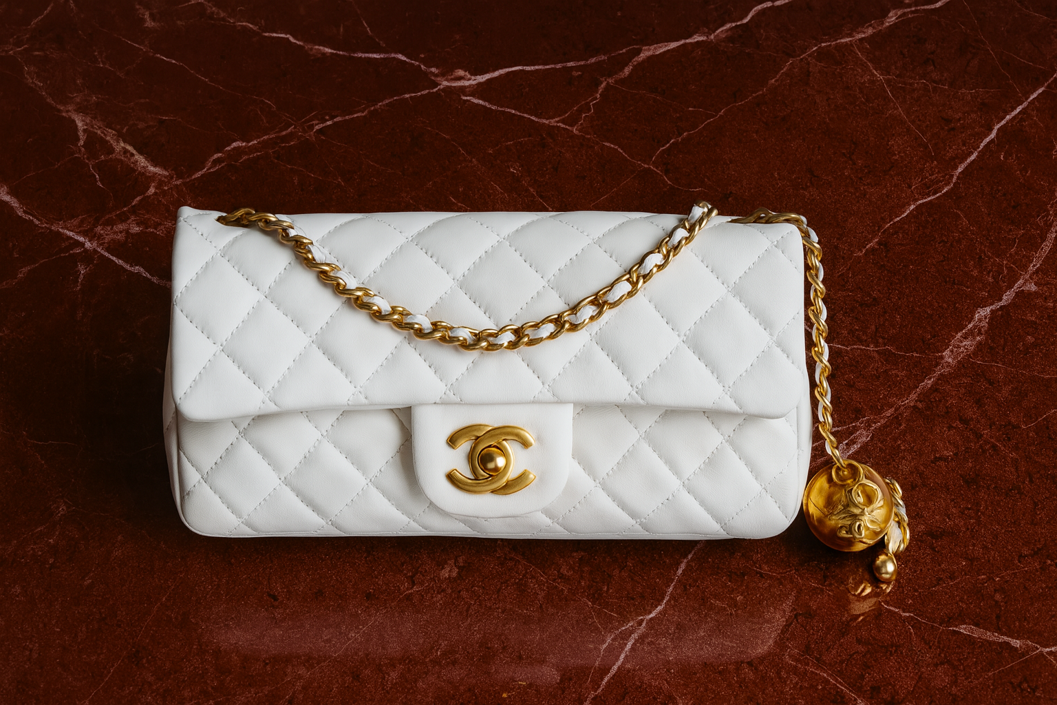 - Adjustable leather-threaded chain strap with gold Chanel ball charm (modern seasonal feature)