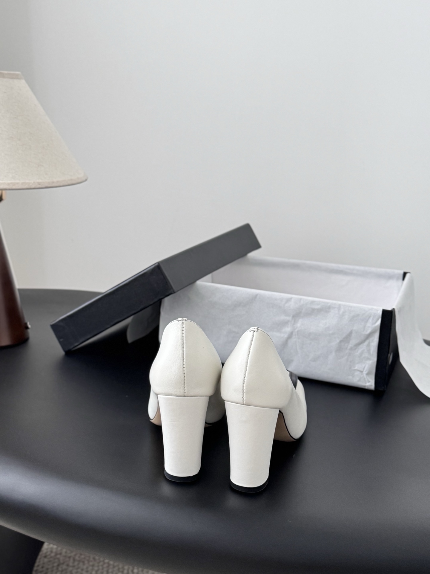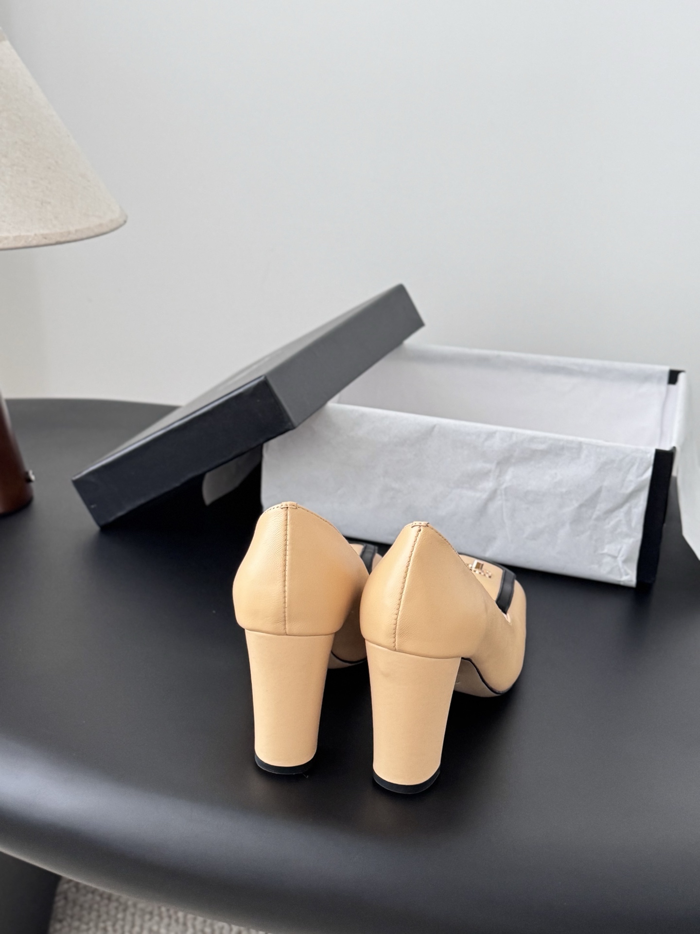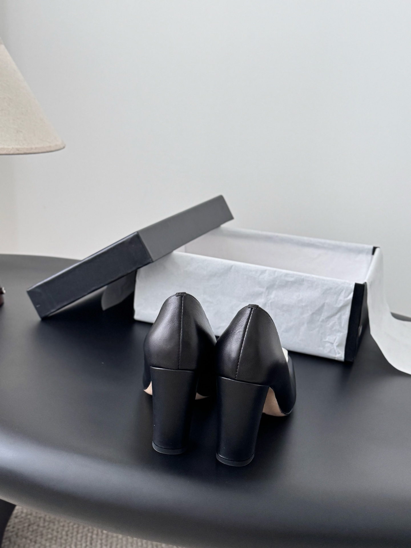 - Mid-height block heel covered in matching lambskin for comfort and stability.