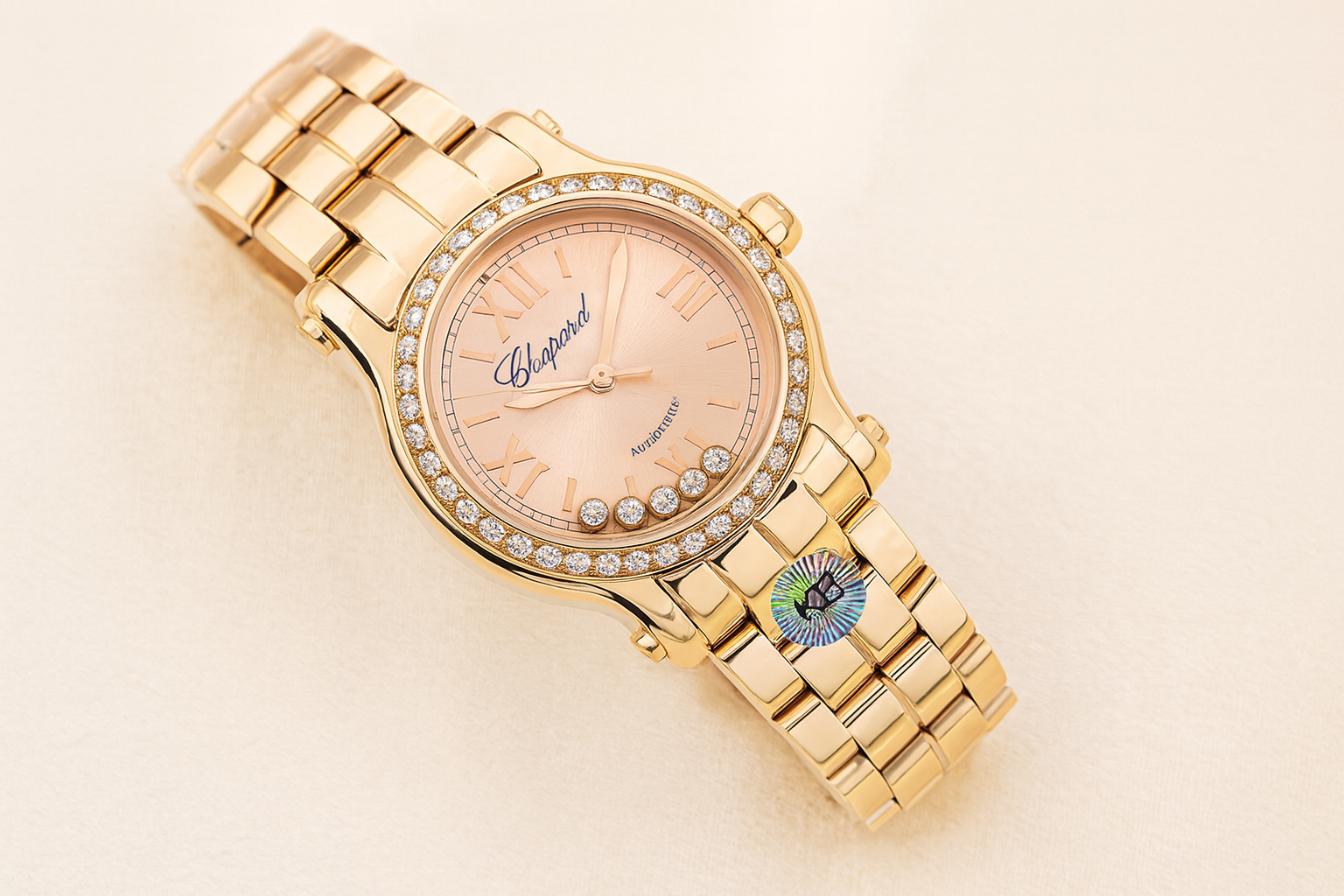 - Dial: Sunburst rose gold dial featuring five floating diamonds between two sapphire crystals — a signature of Chopard’s Happy Sport collection