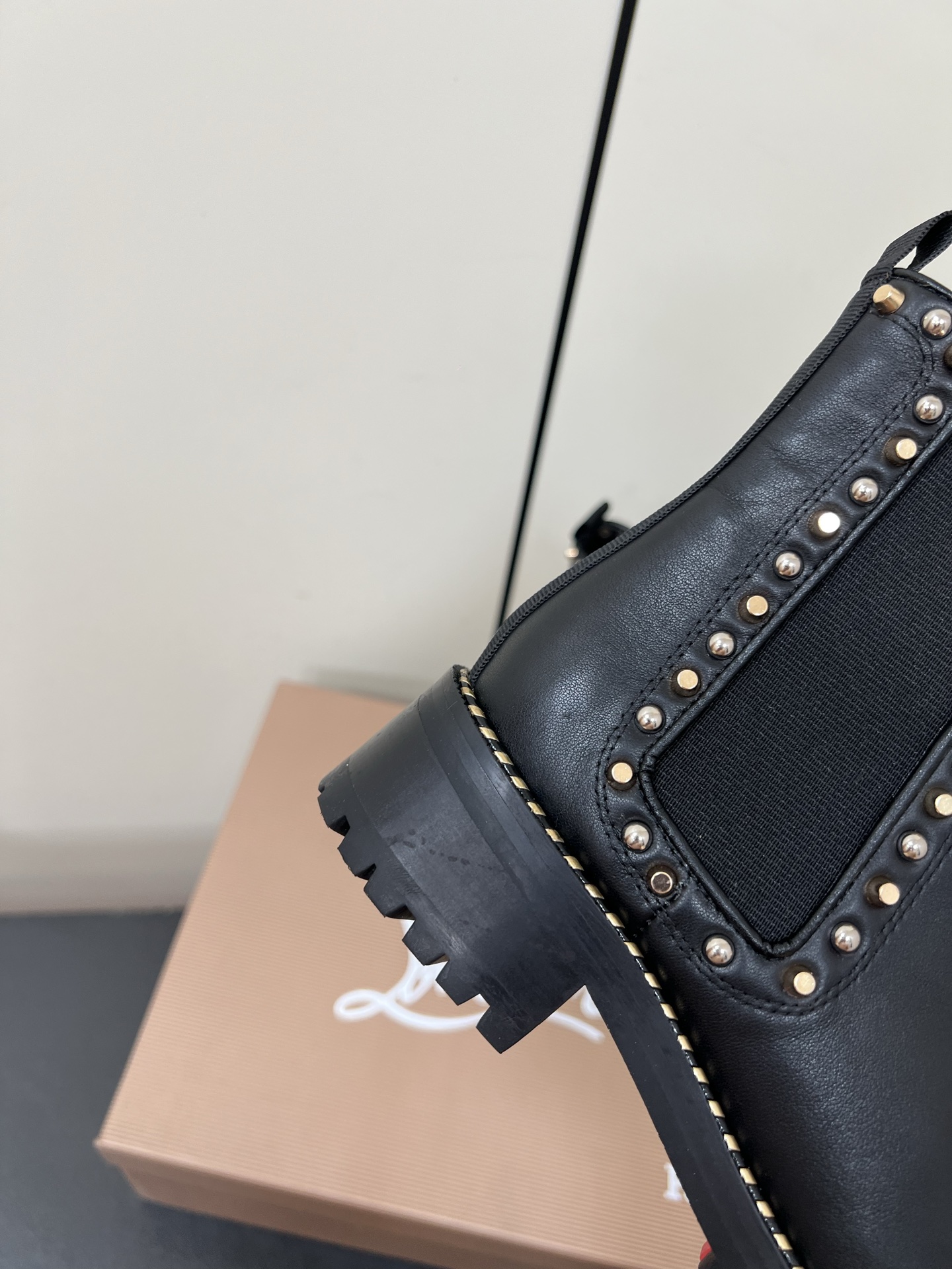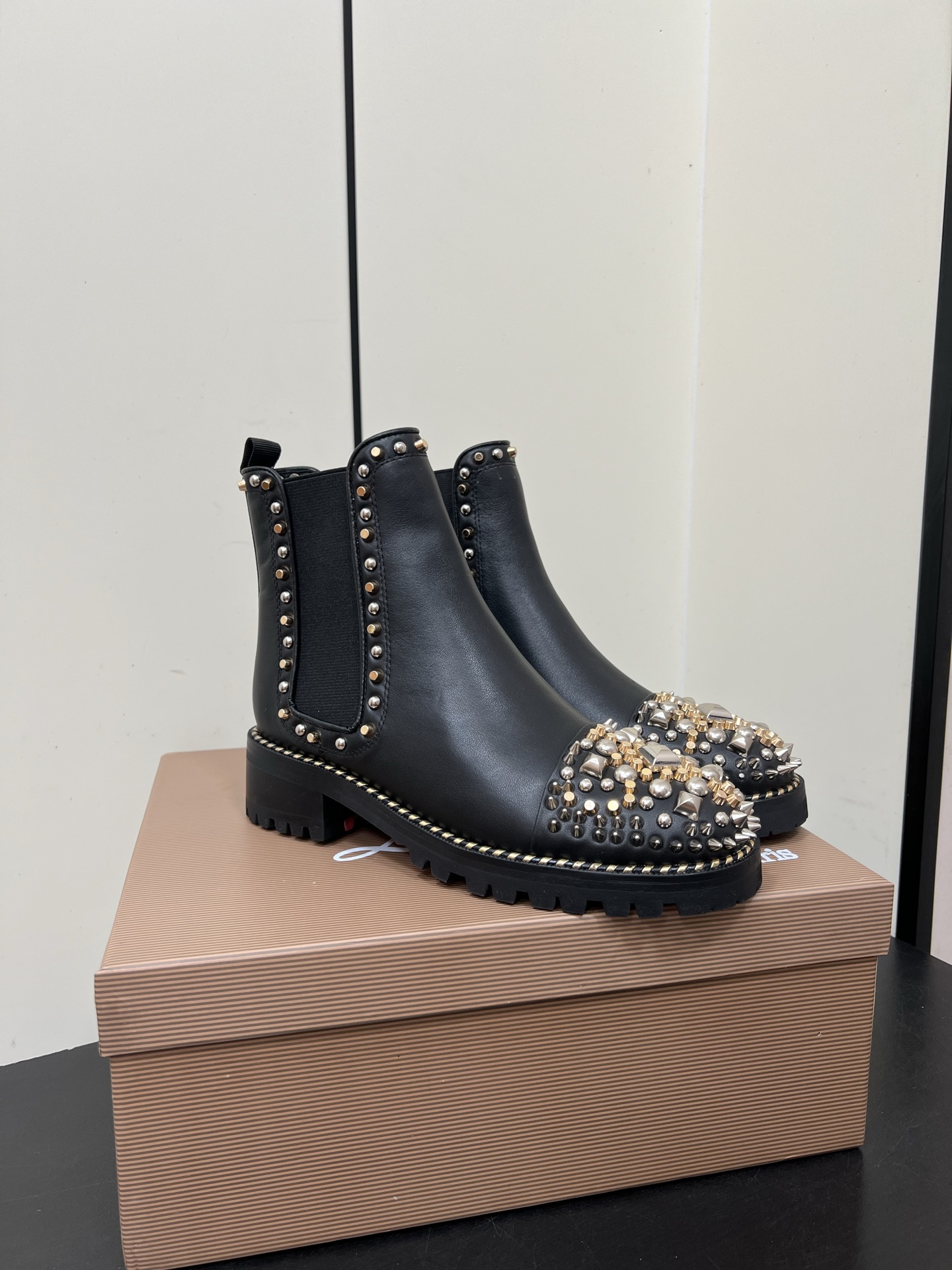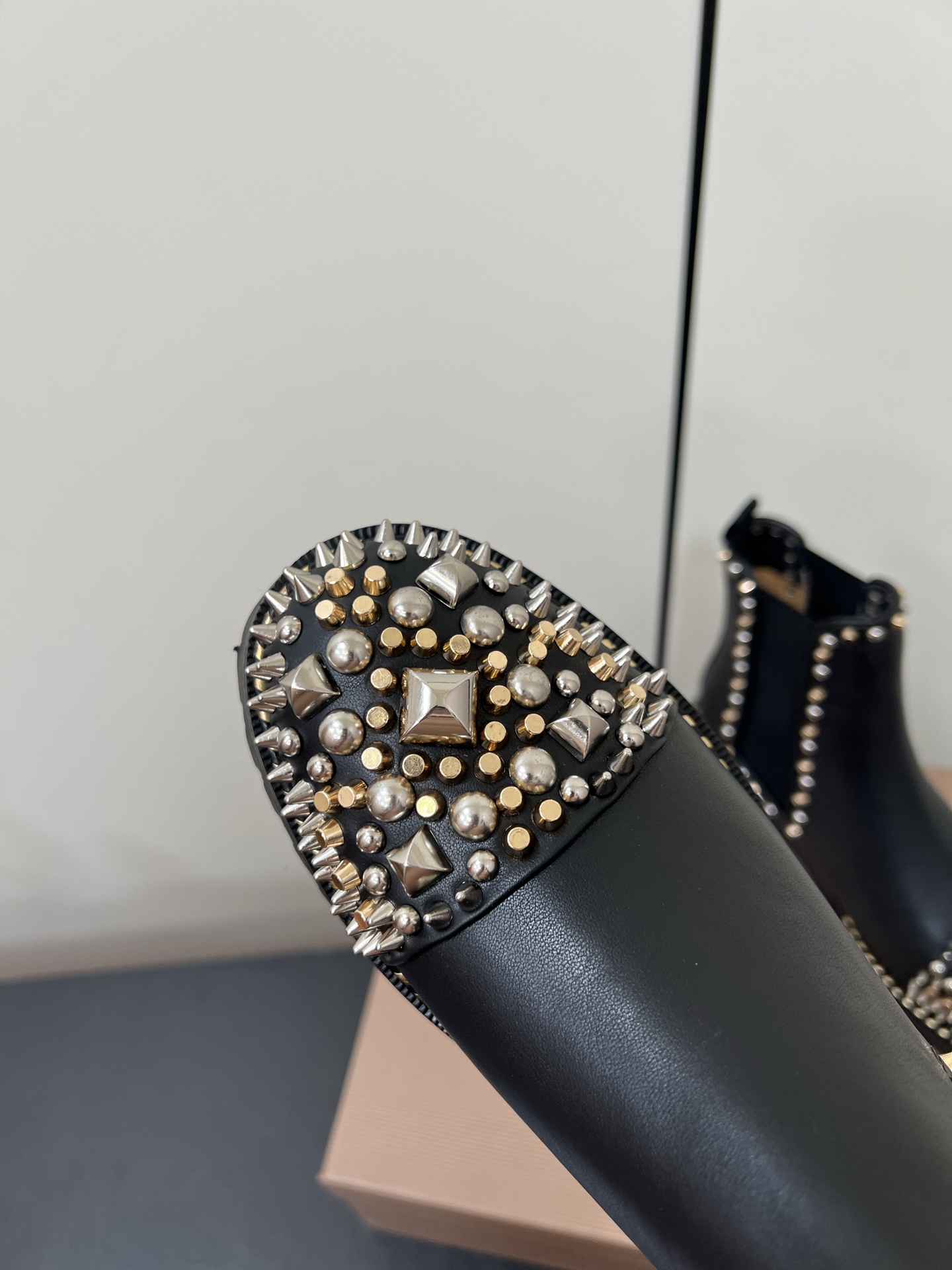 - Studded trim along the boot opening and sides for a cohesive embellished look.