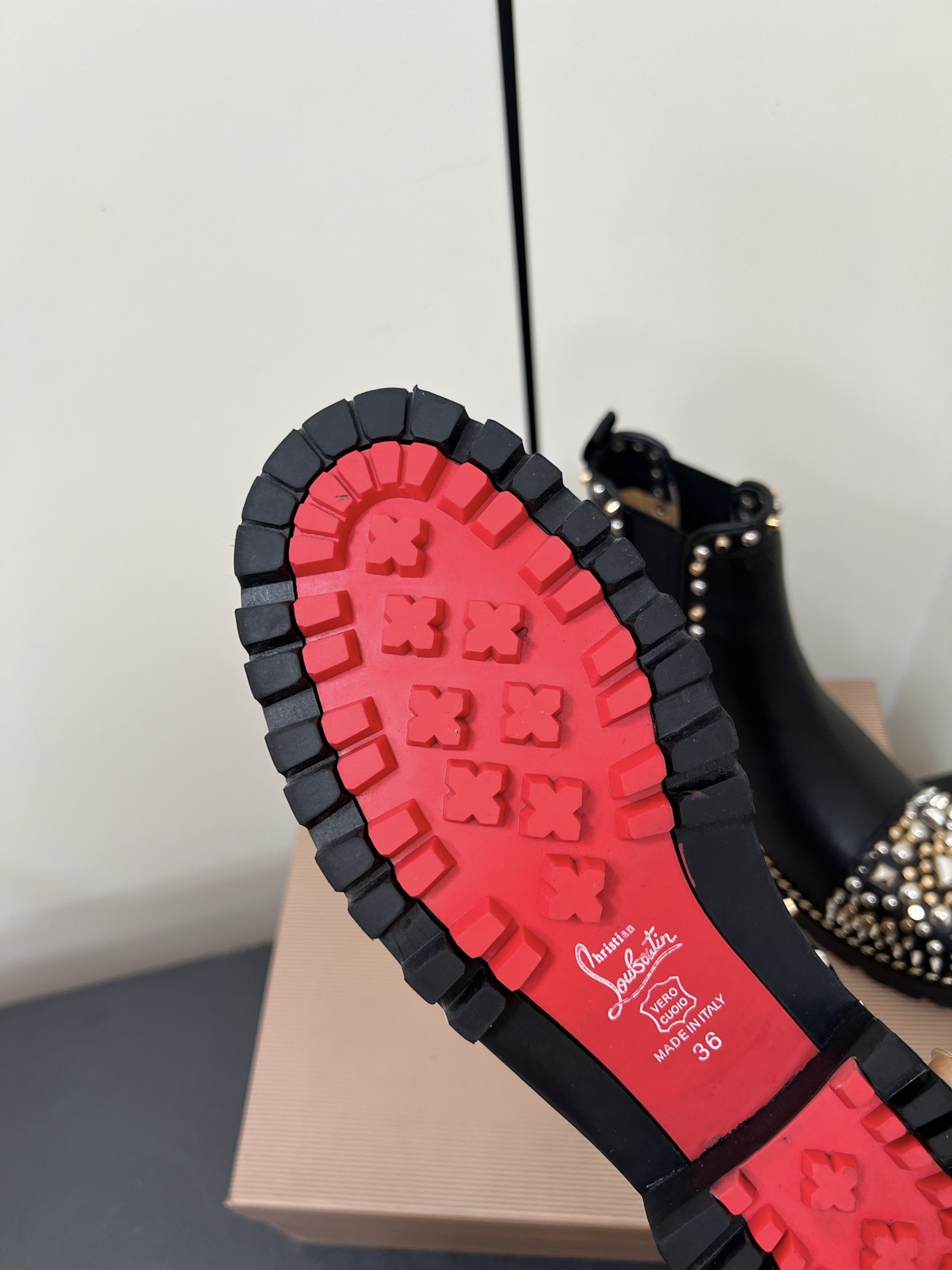 - Finished with Christian Louboutin’s iconic red sole.