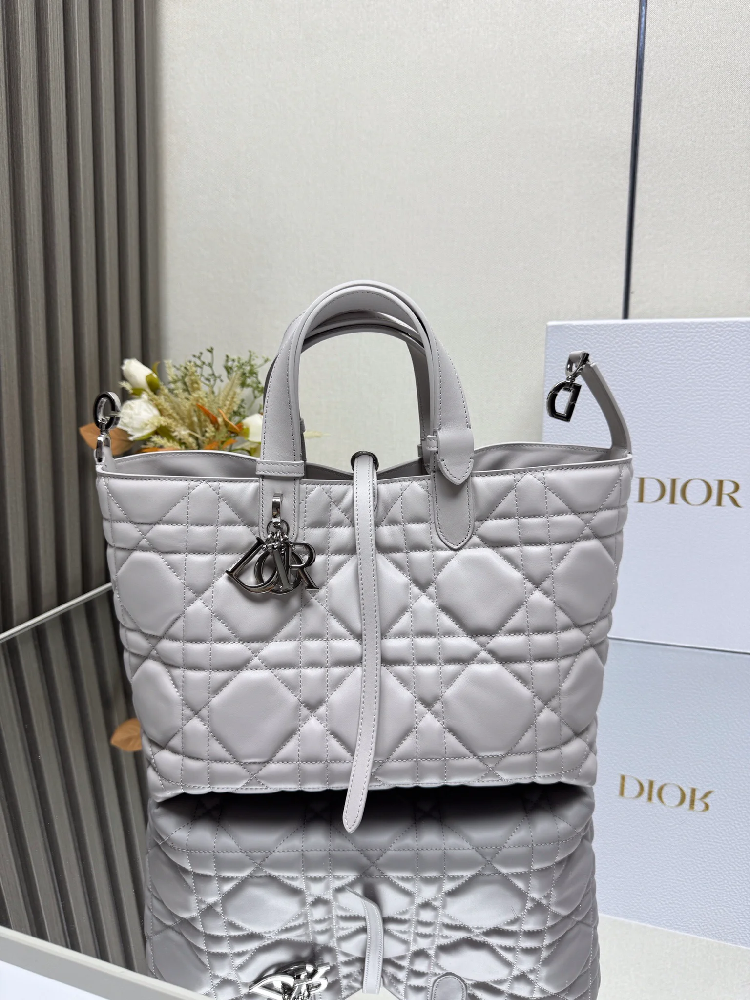 - “D.I.O.R.” metal charms hanging from one handle
