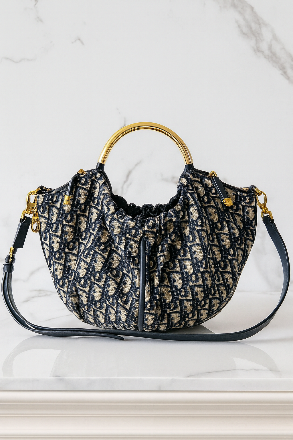 - Handle/Strap: Polished gold-tone rounded top handle + detachable adjustable navy leather shoulder strap