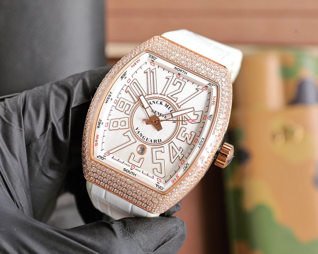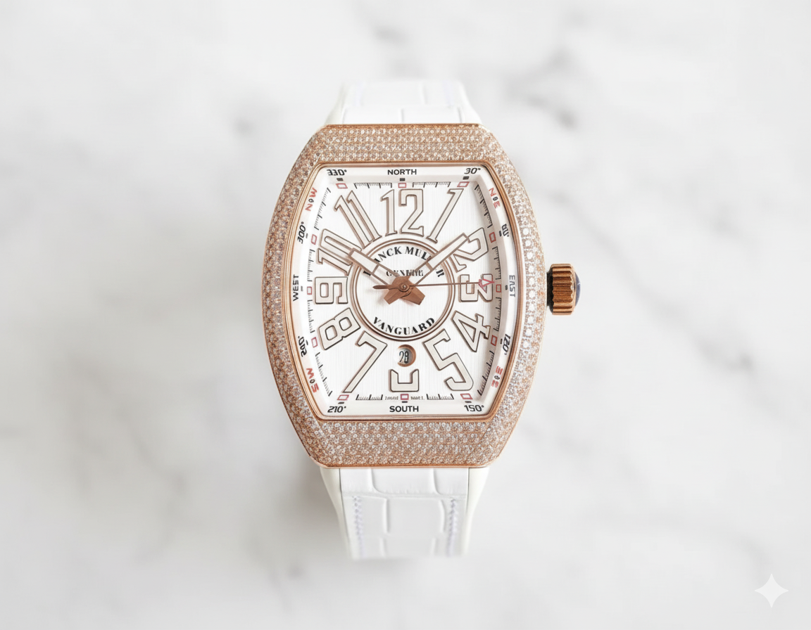 The Franck Muller Vanguard Rose Gold Diamond Watch is a bold fusion of innovation and elegance. Its sculptural form, radiant diamond detailing, and refined white alligator strap capture the essence of modern luxury—making it a standout piece for connoisseurs who embrace daring sophistication and impeccable style.