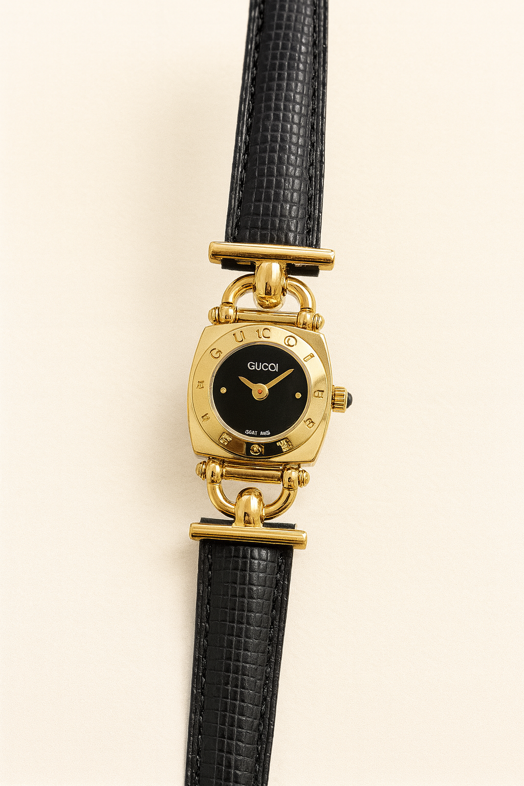 The Gucci 3900 Series G-Frame Women’s Watch blends Italian artistry with Swiss horological excellence. Its refined gold frame, deep black dial, and smooth leather strap reflect understated opulence. Designed for the confident woman, this timepiece adds a touch of effortless glamour and sophistication to any look — a true statement of timeless Gucci elegance.