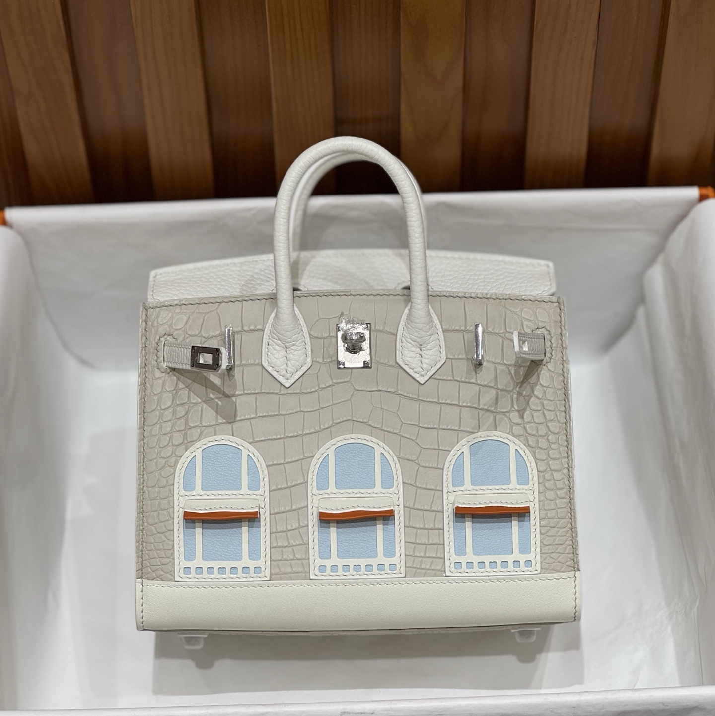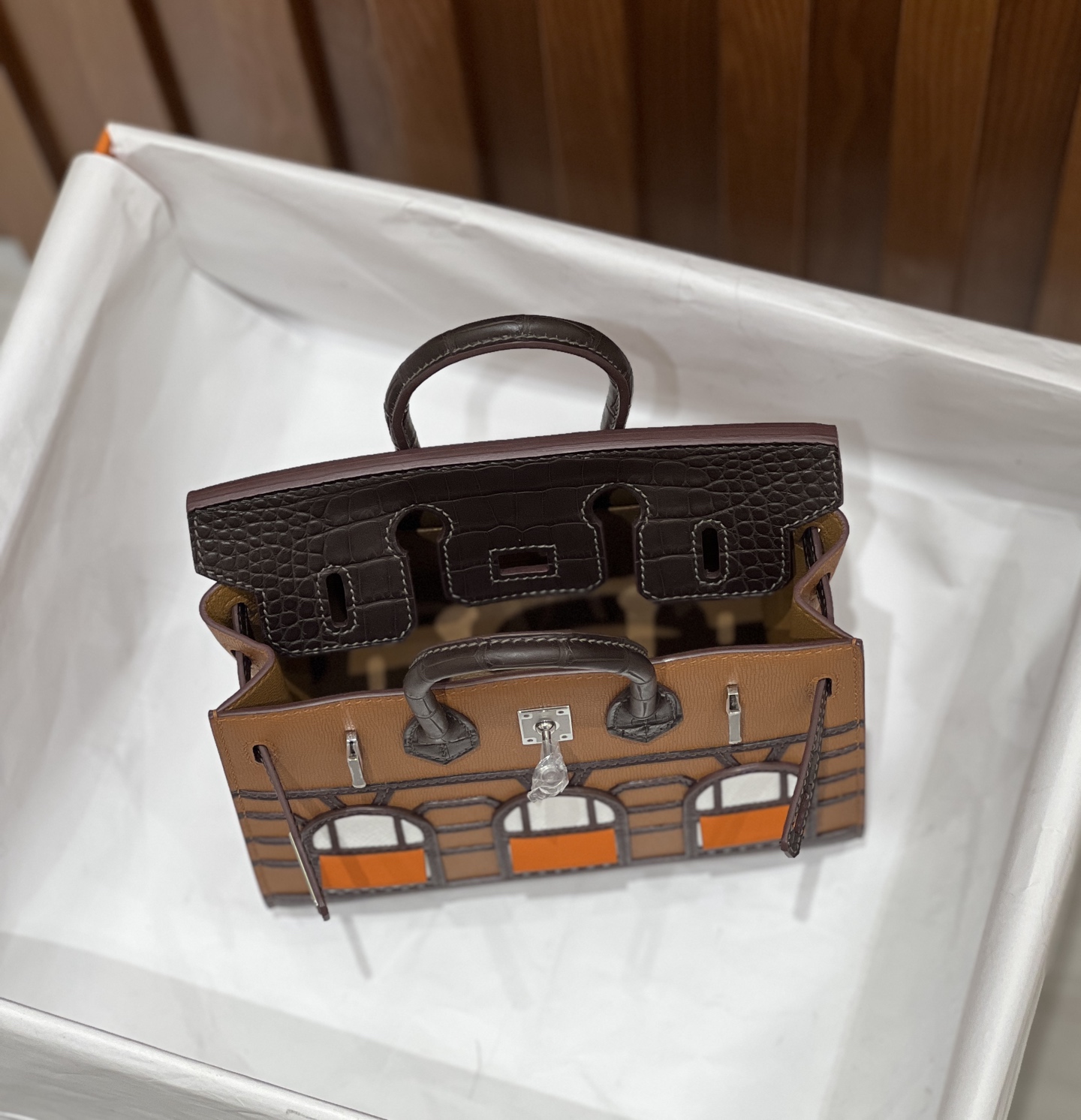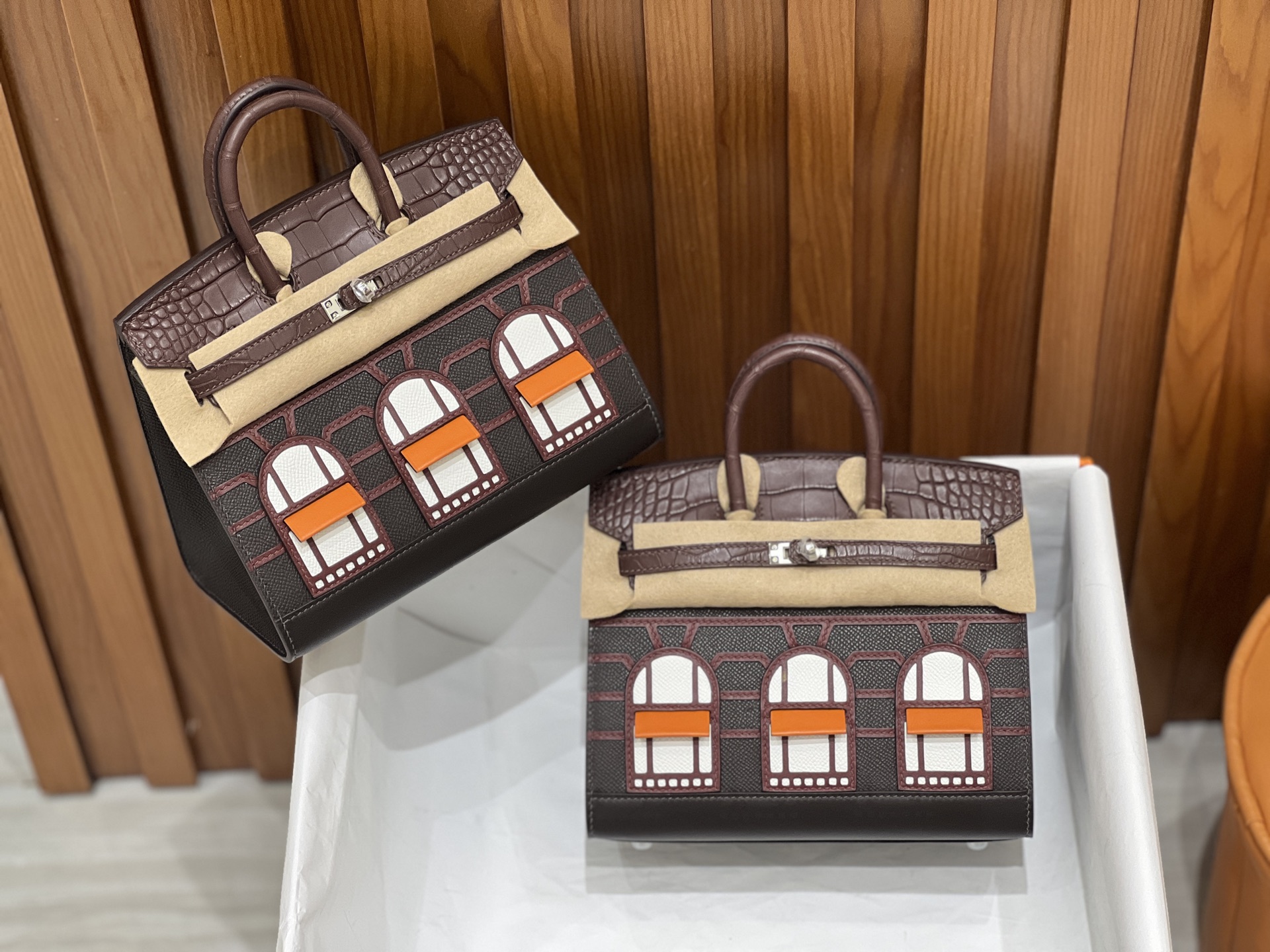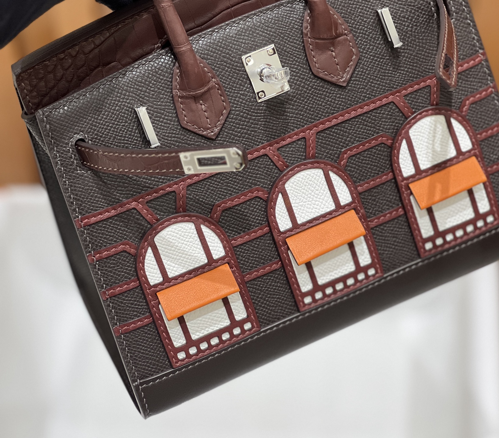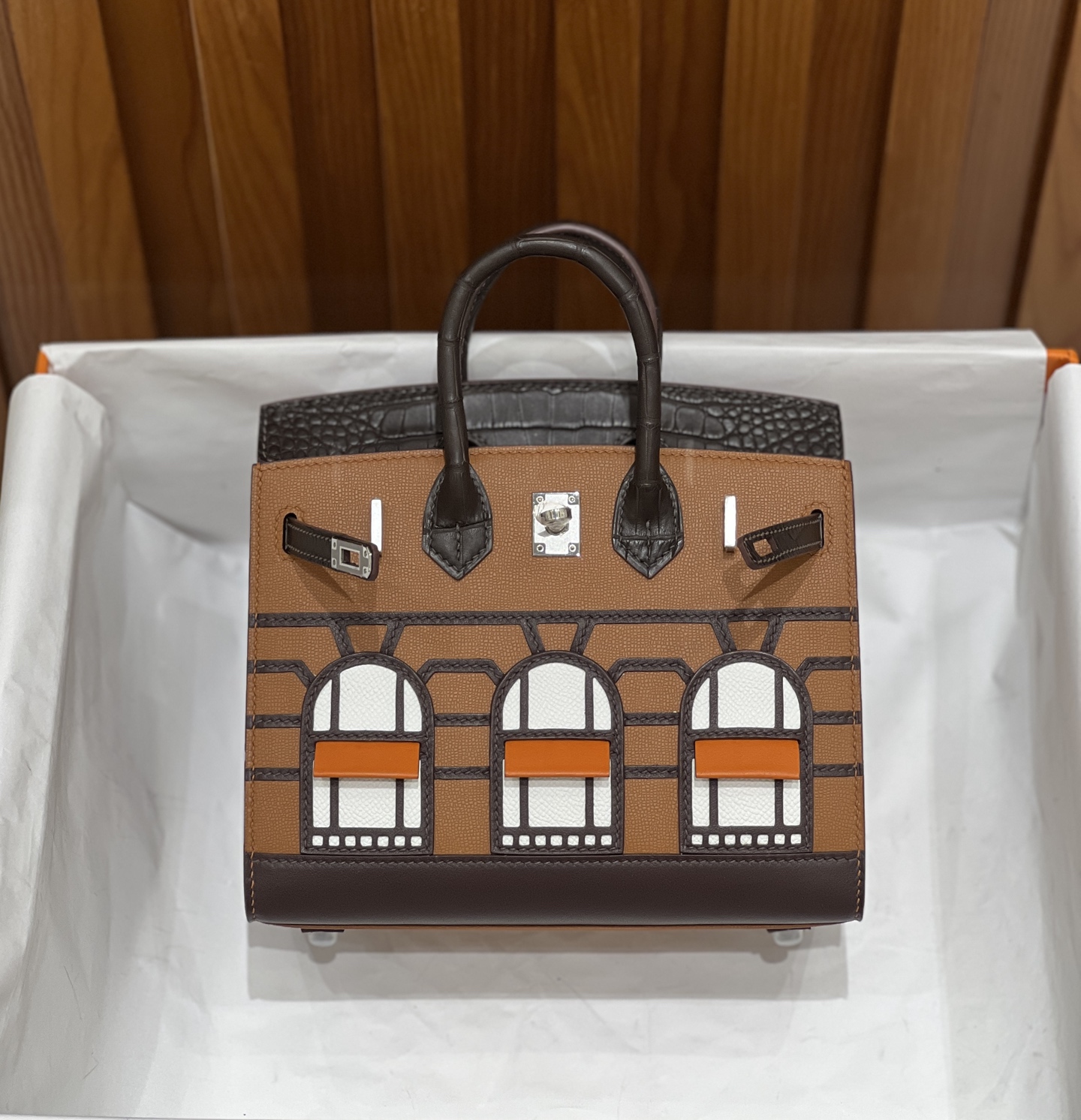 Material: Premium Epsom leather with multi-panel architectural leather appliqué, inspired by the historic Hermès flagship at 24 Rue du Faubourg Saint-Honoré.
