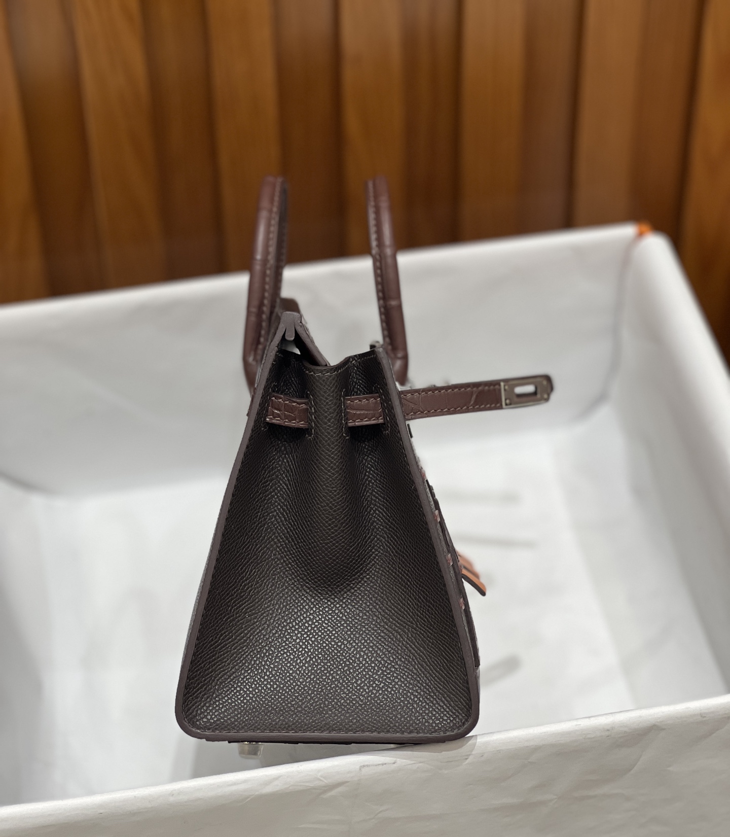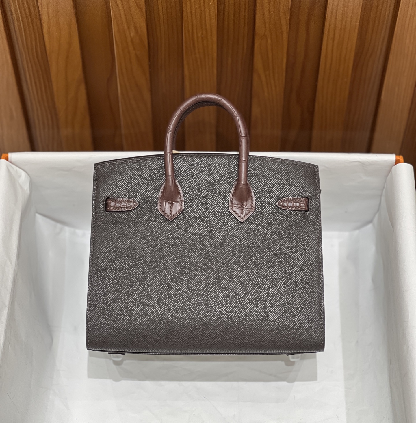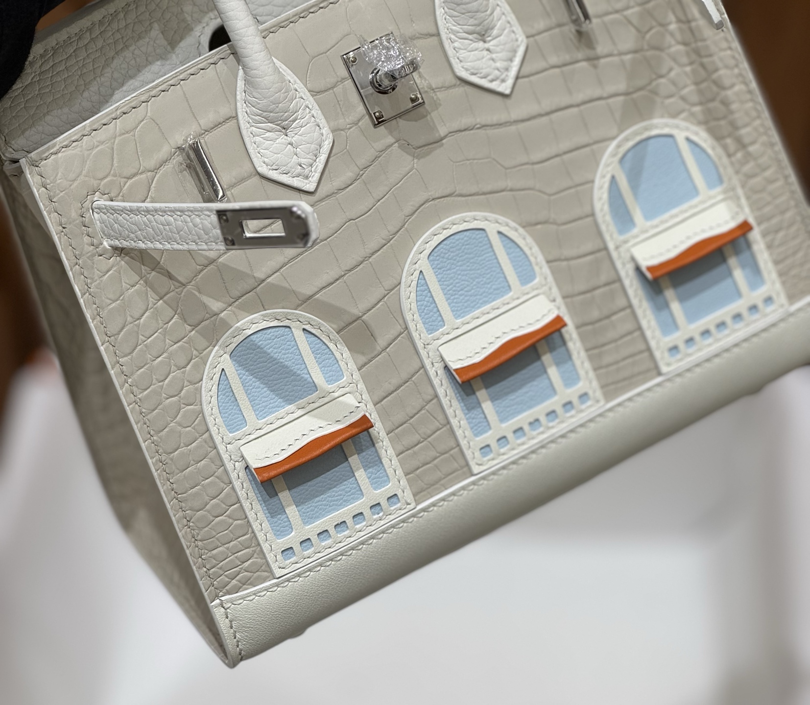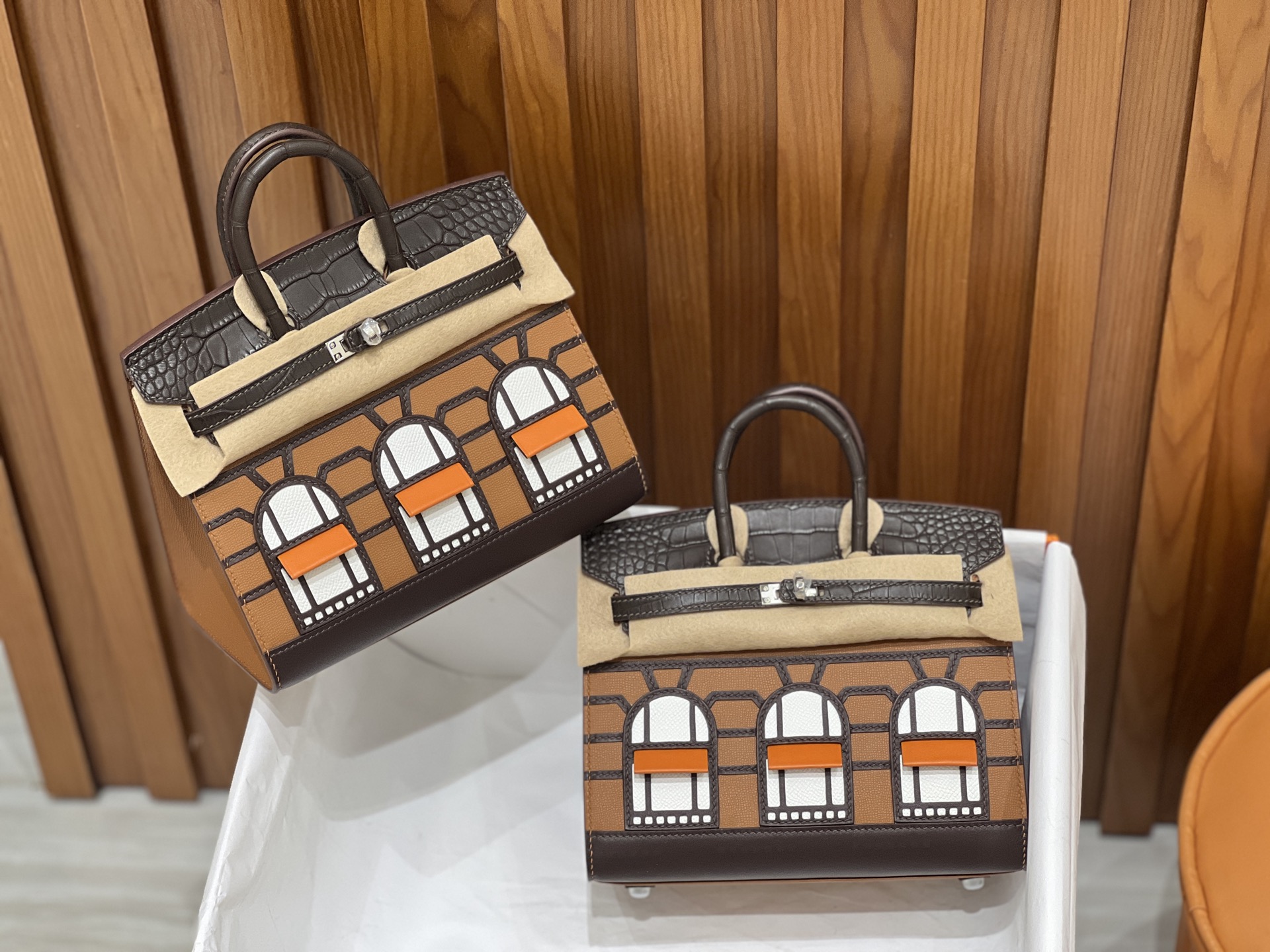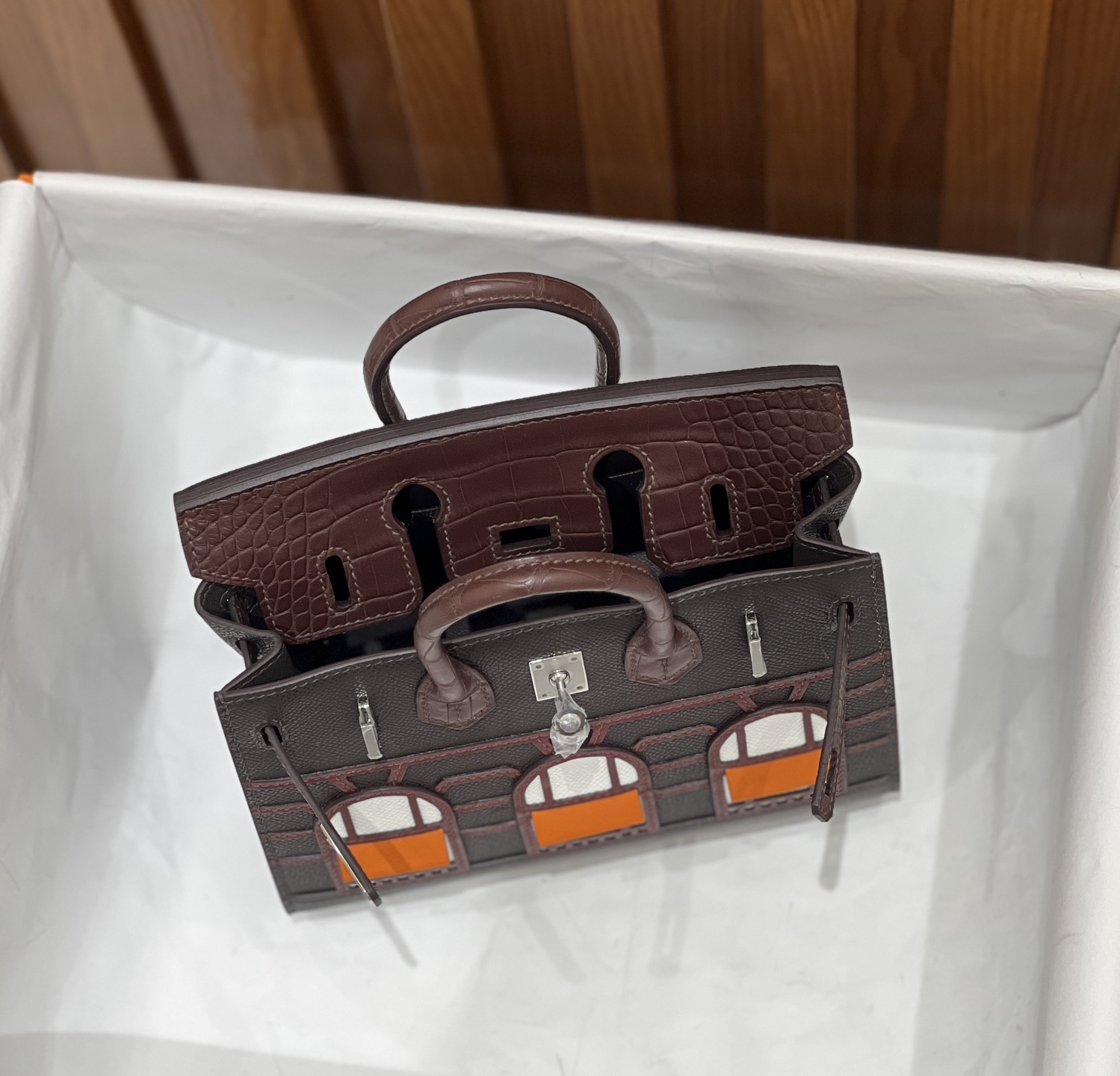 Material: Premium Epsom leather with multi-panel architectural leather appliqué, inspired by the historic Hermès flagship at 24 Rue du Faubourg Saint-Honoré.
