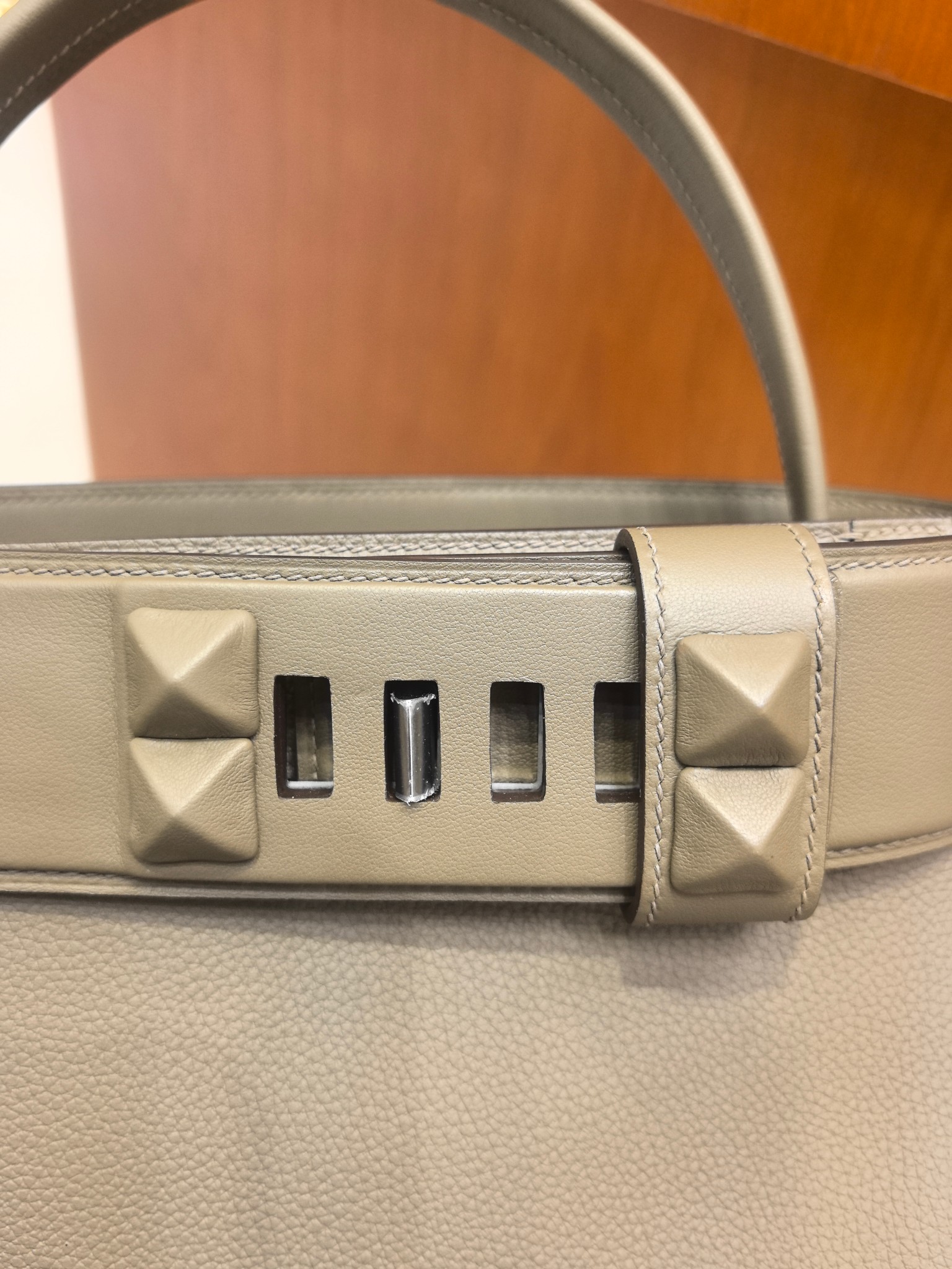 - Top Bar: Smooth matching leather with four bold pyramid Médor studs and a central turn-lock closure.