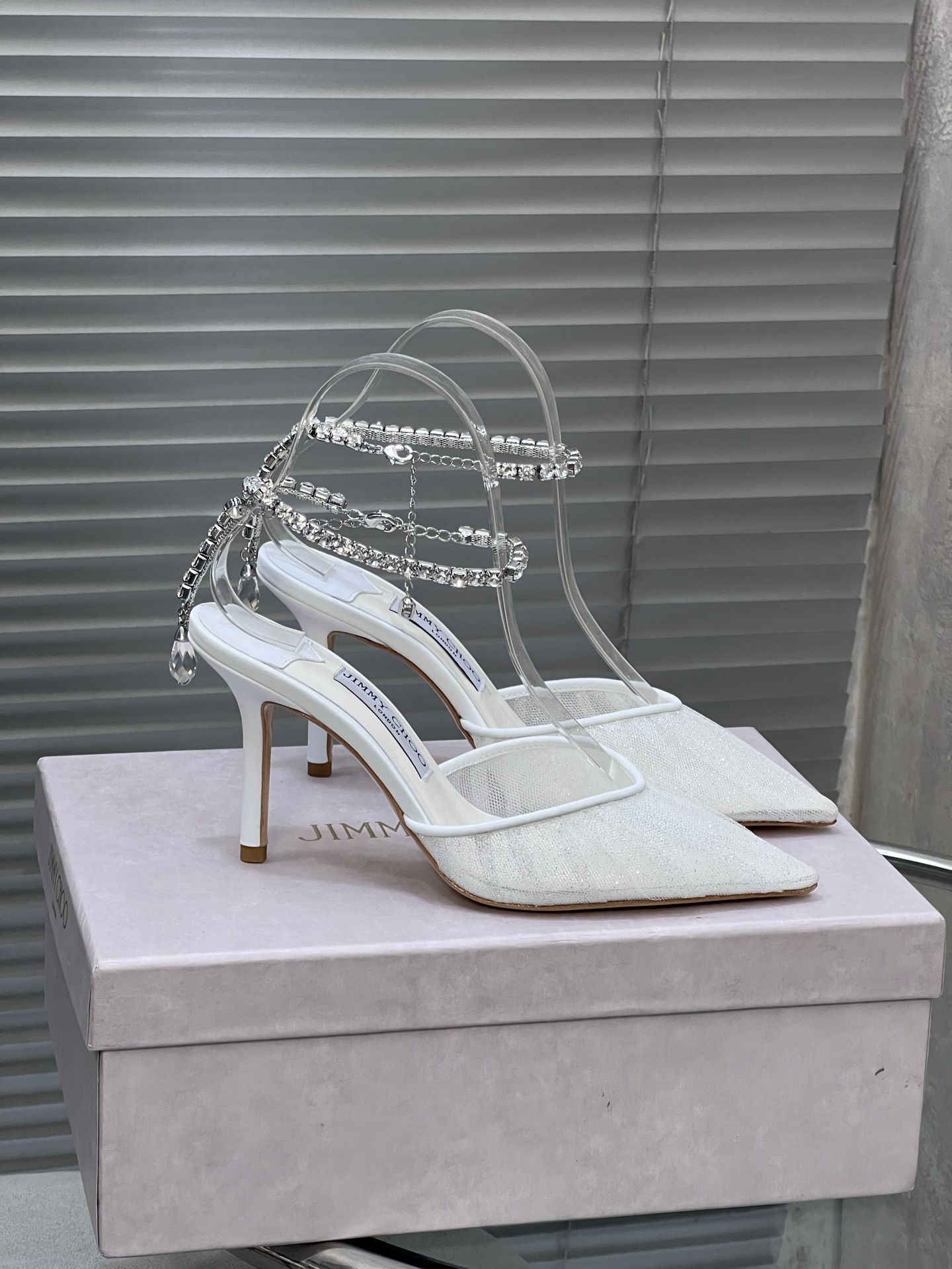 An icon of refined glamour, the Jimmy Choo Saeda 85 Pumps in ivory tulle capture the essence of timeless elegance. Expertly crafted in delicate sheer ivory tulle, these pointed-toe pumps are adorned with a stunning crystal anklet chain featuring a signature teardrop pendant that glimmers with every step.
