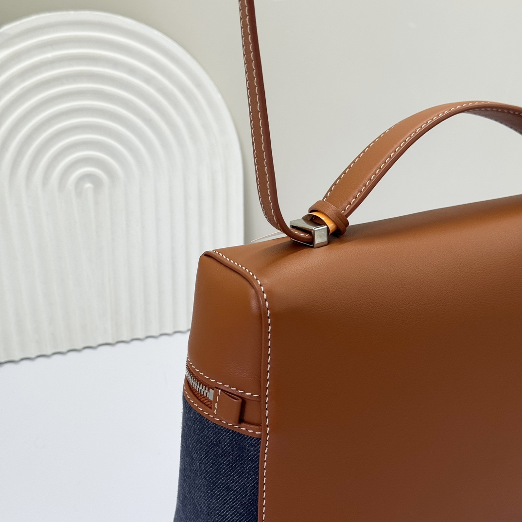 - Elevated everyday design combining casual denim with luxury leather trim