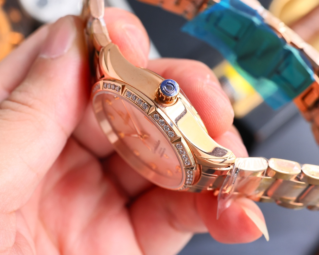 Dial: Striking pink mother-of-pearl dial, enriched with diamond hour markers and delicately polished gold hands, creating a harmonious balance of sophistication.