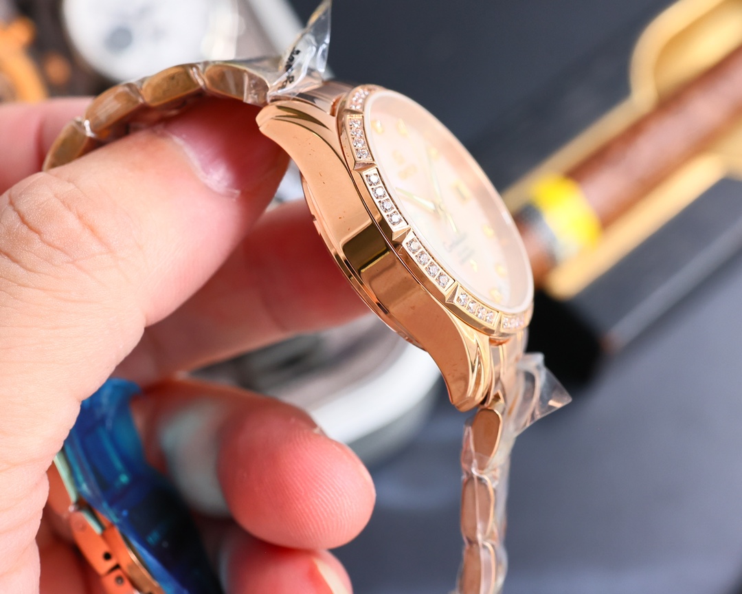 Case & Bezel: 27mm stainless steel case paired with 18K yellow gold bezel, fully set with brilliant-cut diamonds for exceptional brilliance.