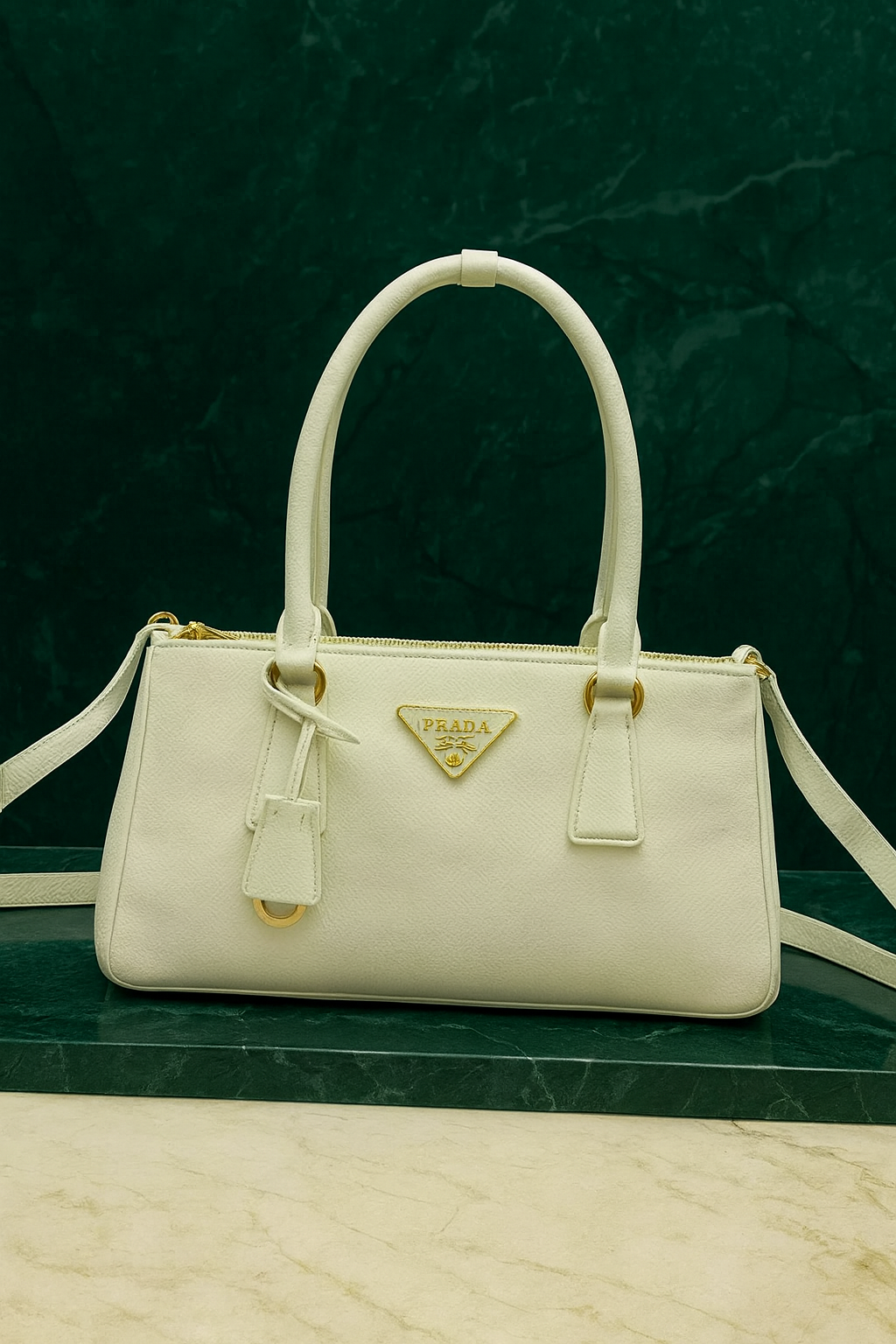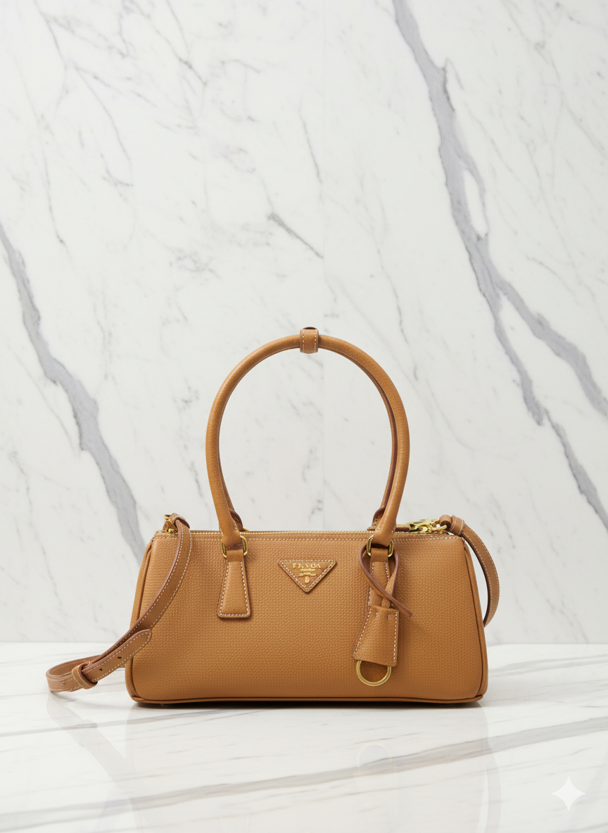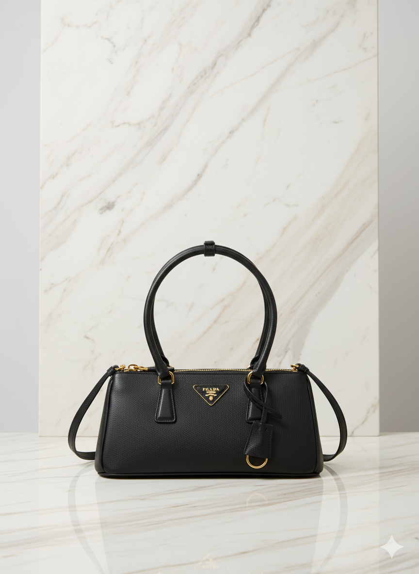 - Structured trapezoid silhouette — Prada’s timeless Galleria line