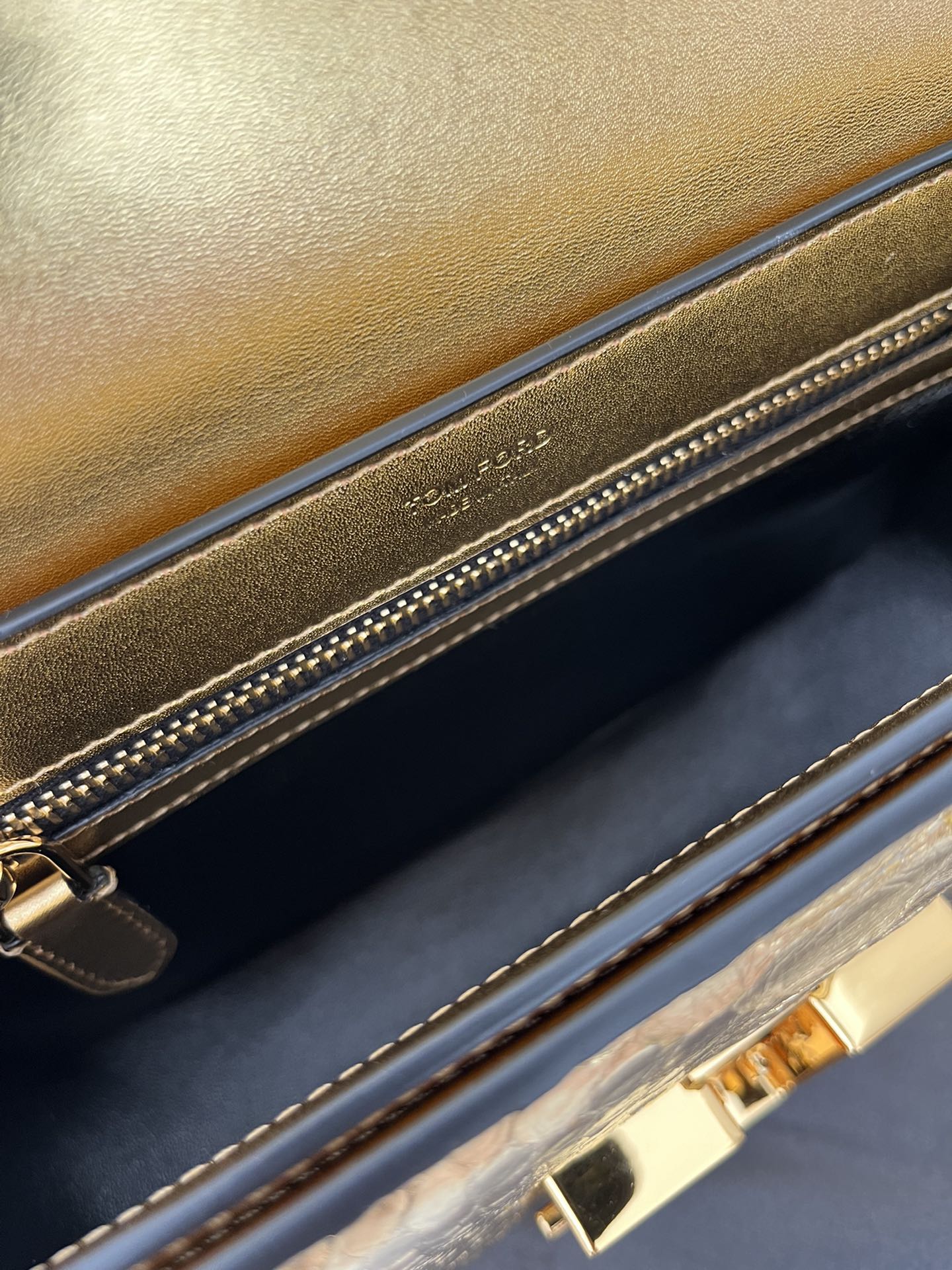 - Front flap closure secured by Tom Ford’s signature T hardware