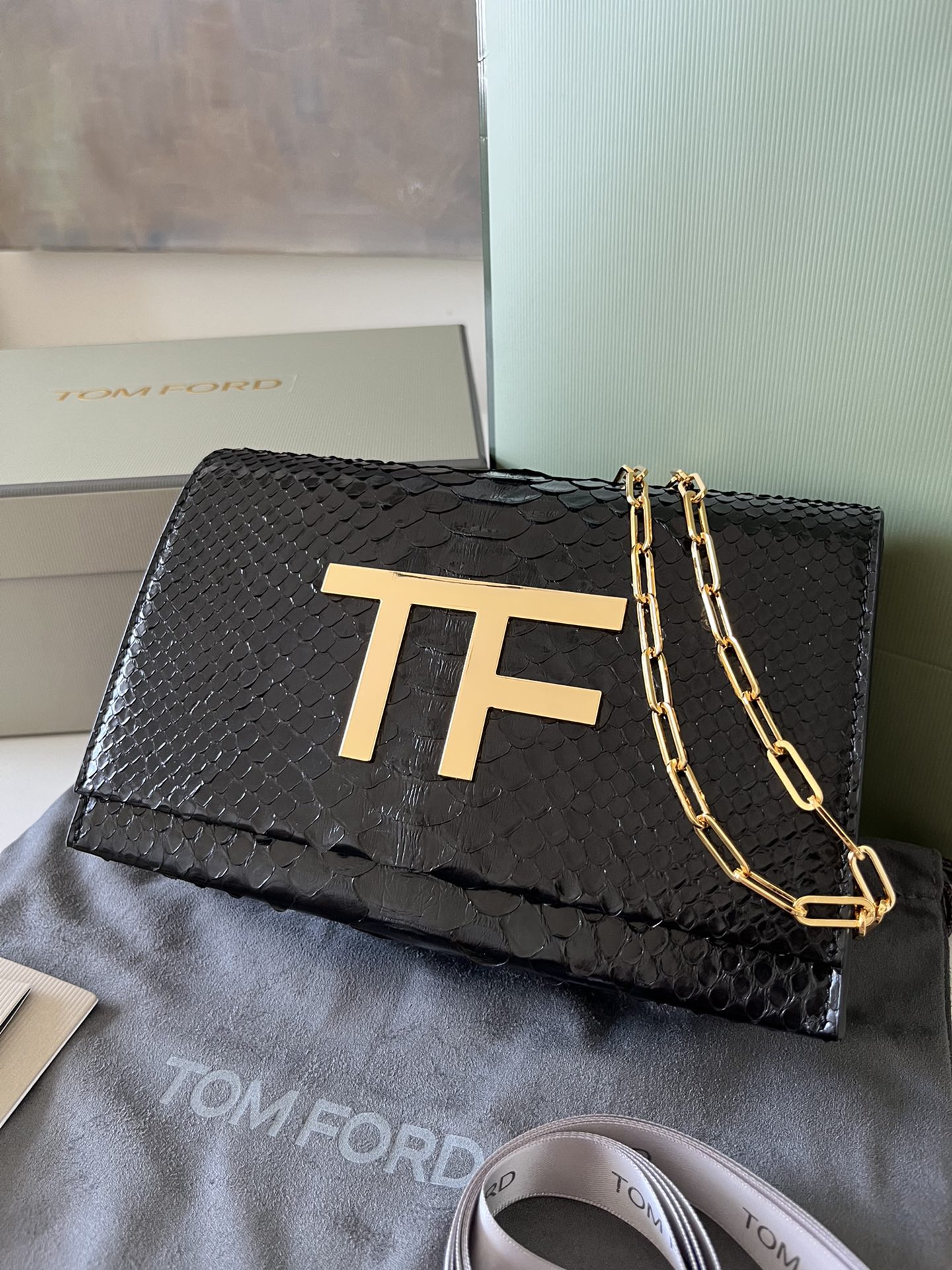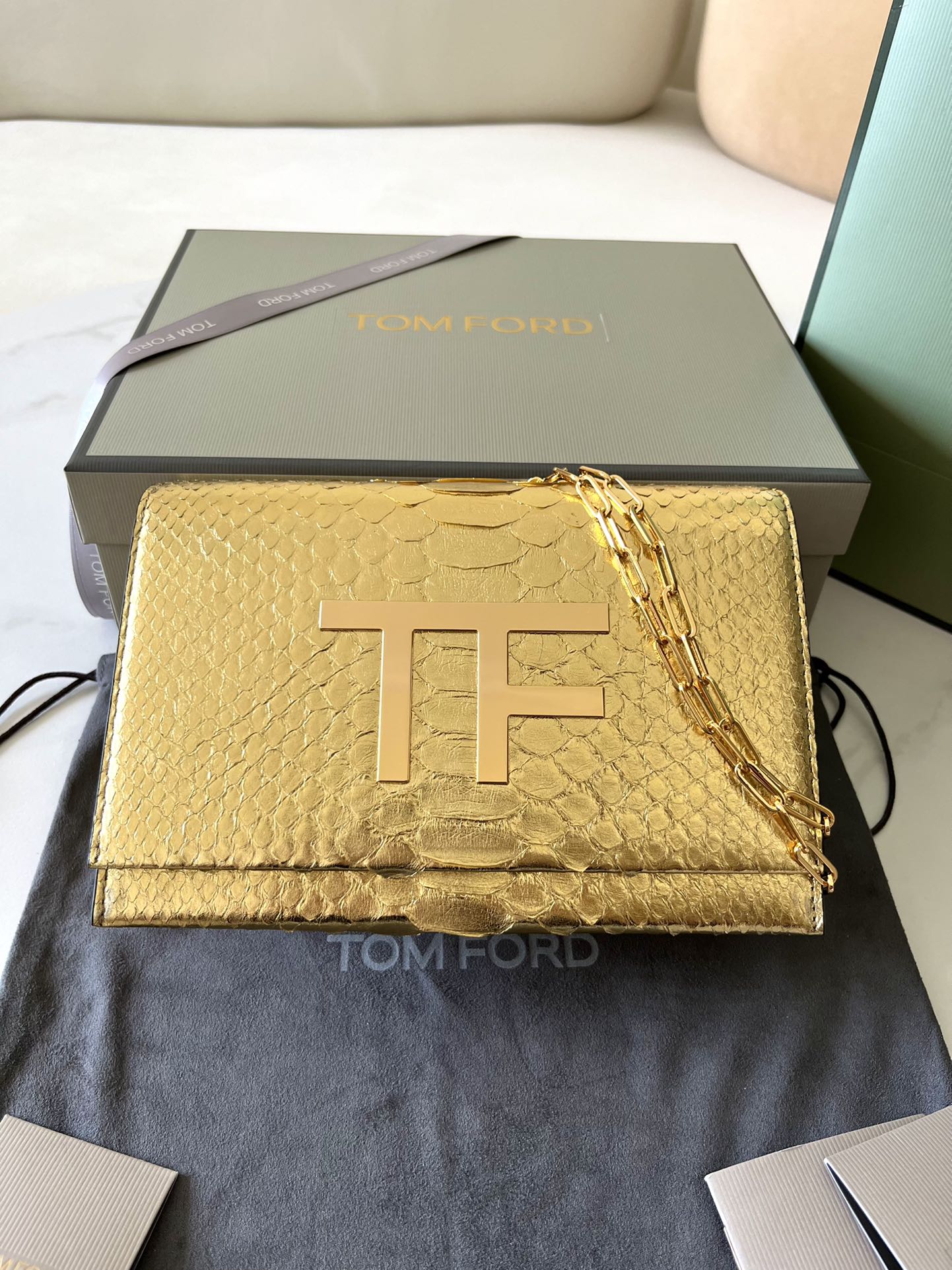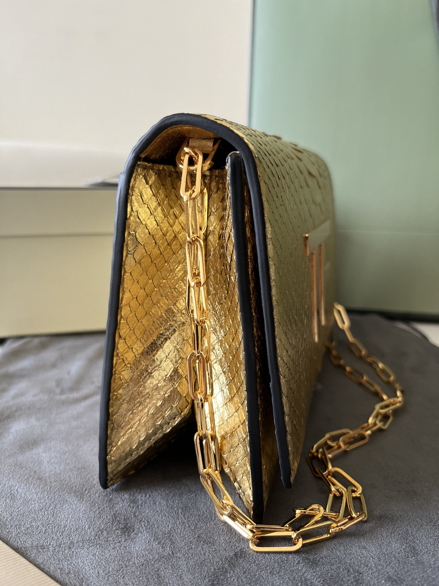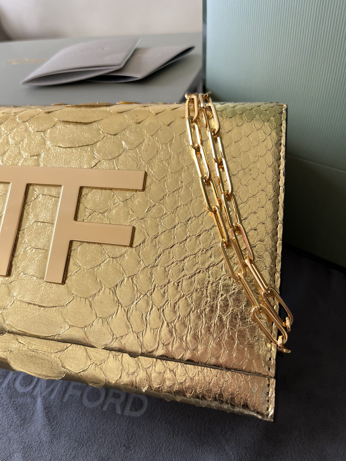 • Signature oversized TF gold-tone logo displayed prominently on the front flap