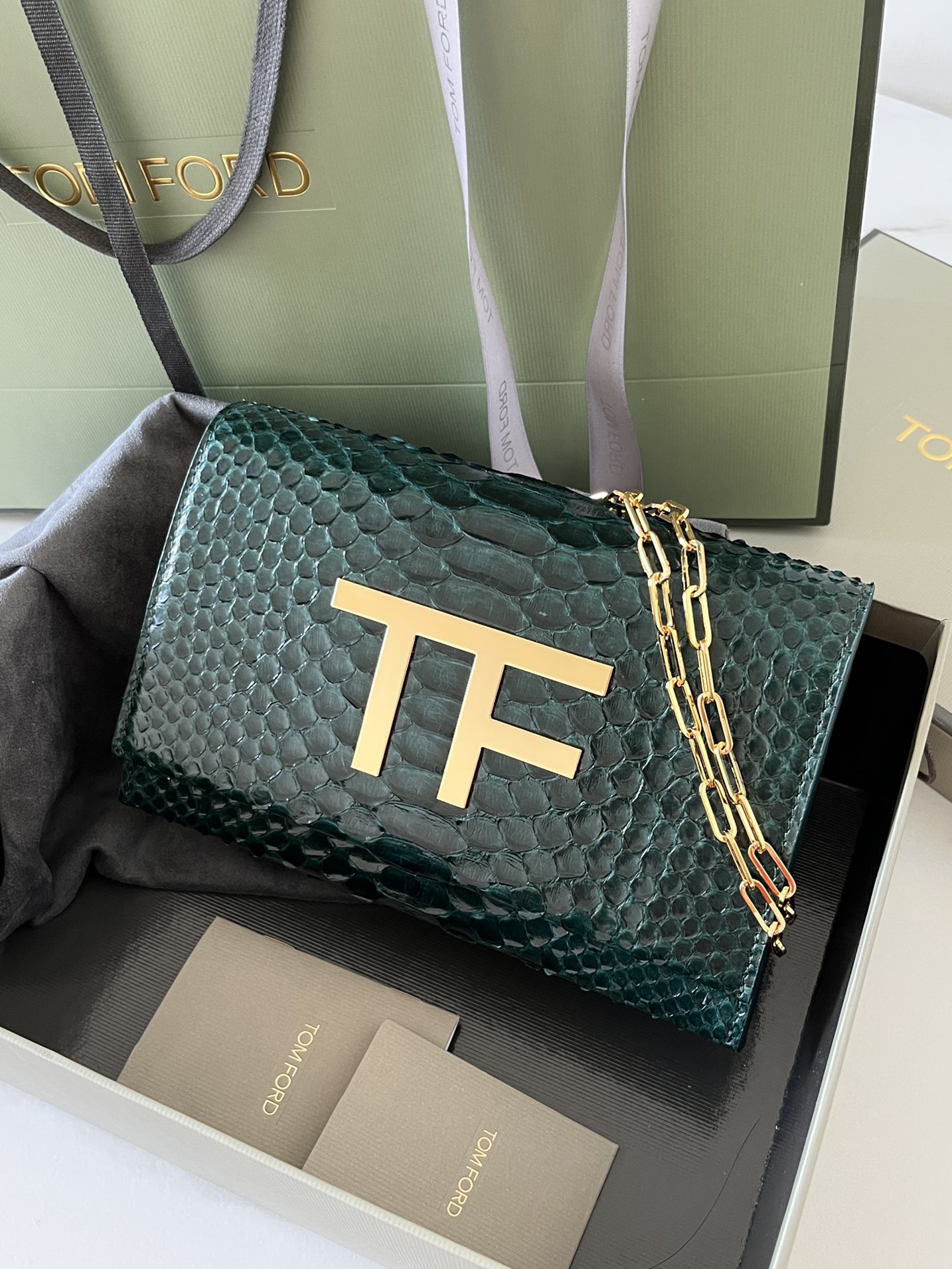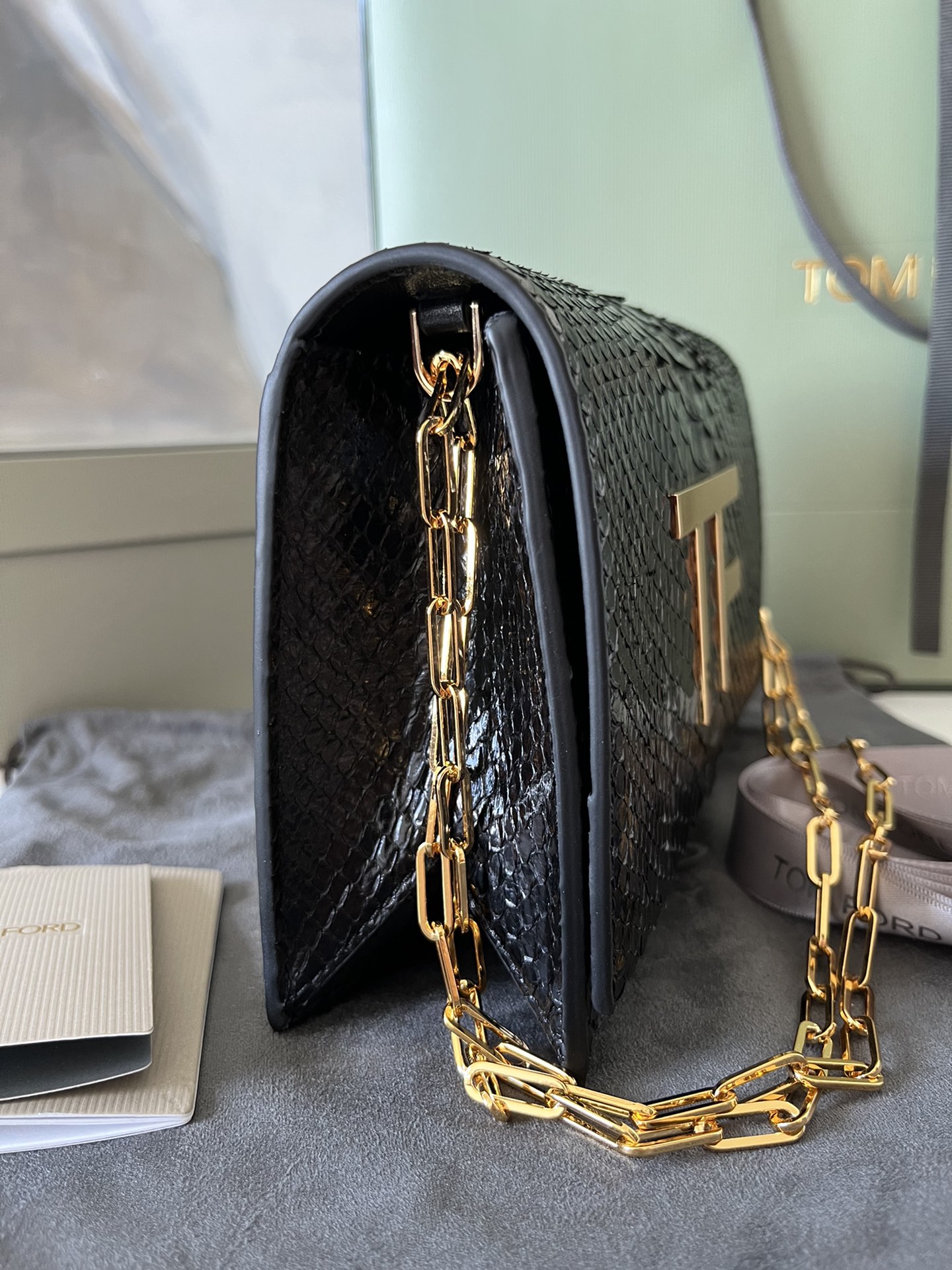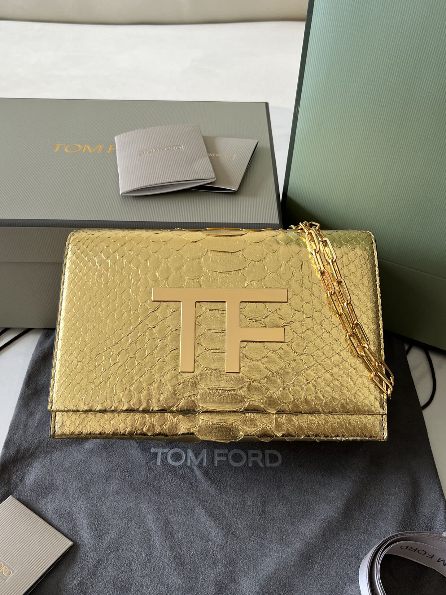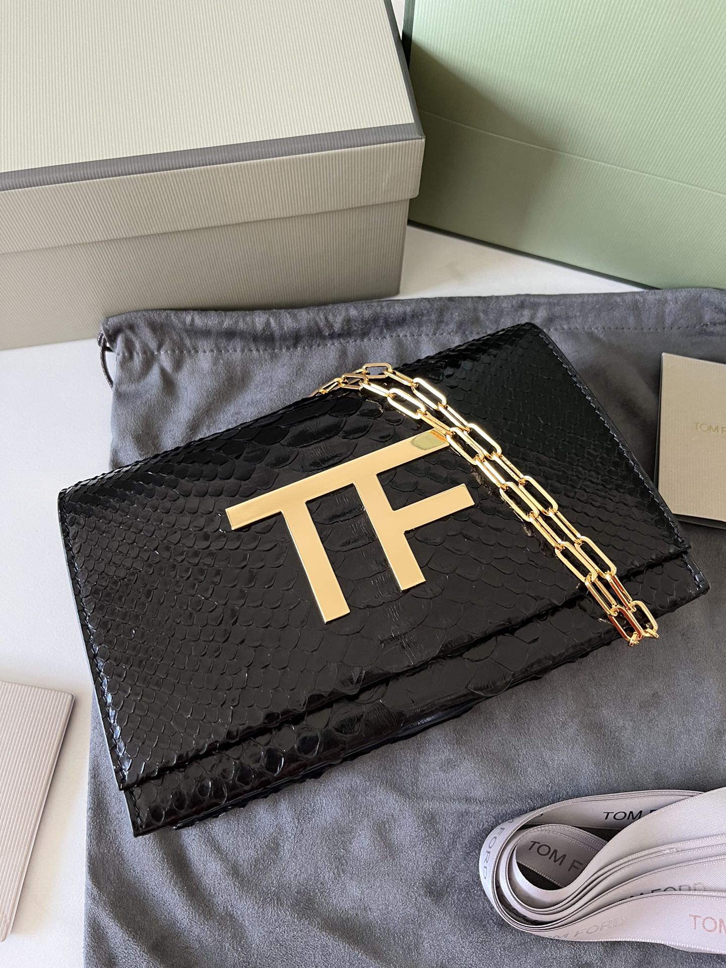 • Signature oversized TF gold-tone logo displayed prominently on the front flap