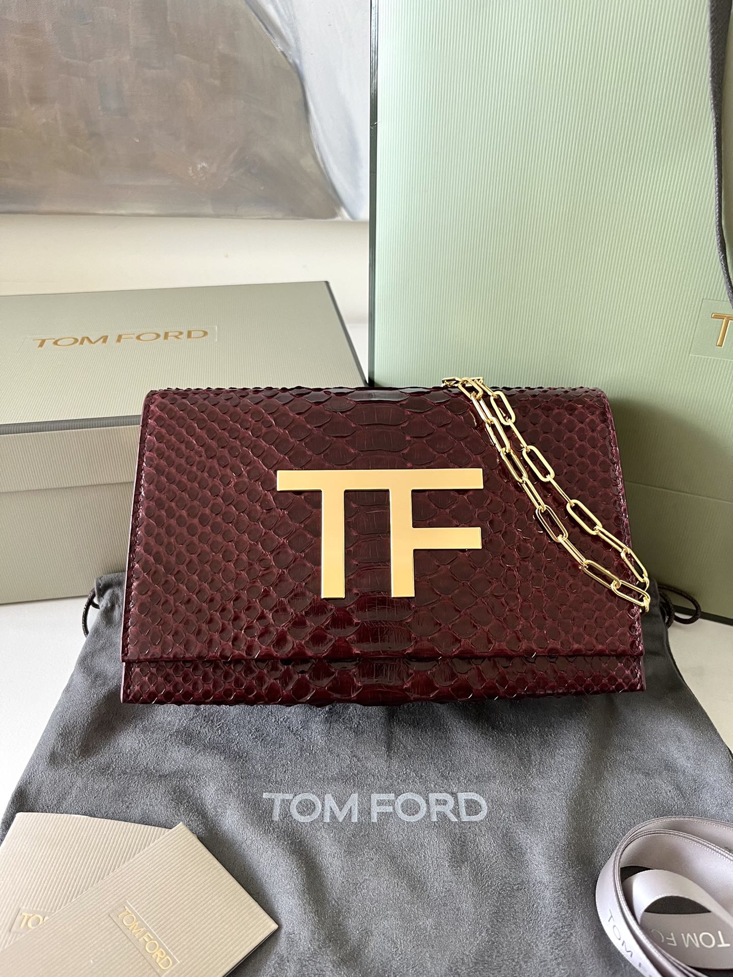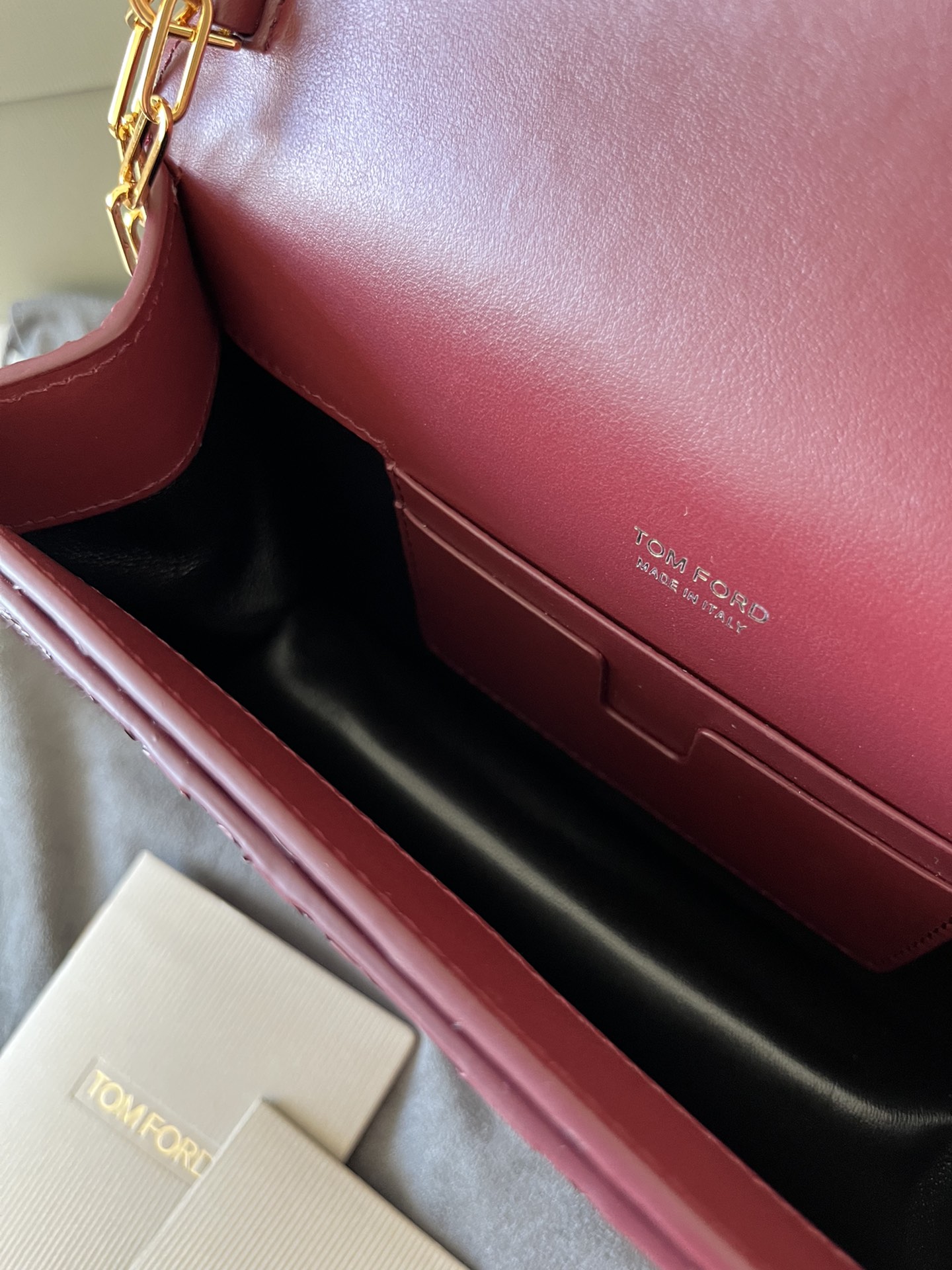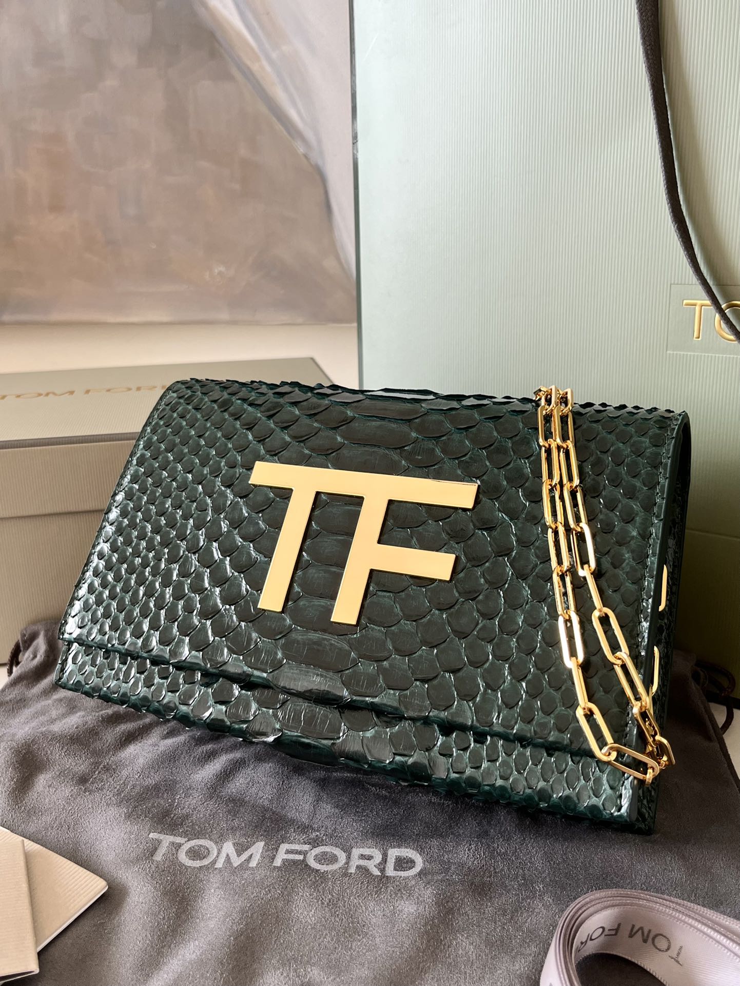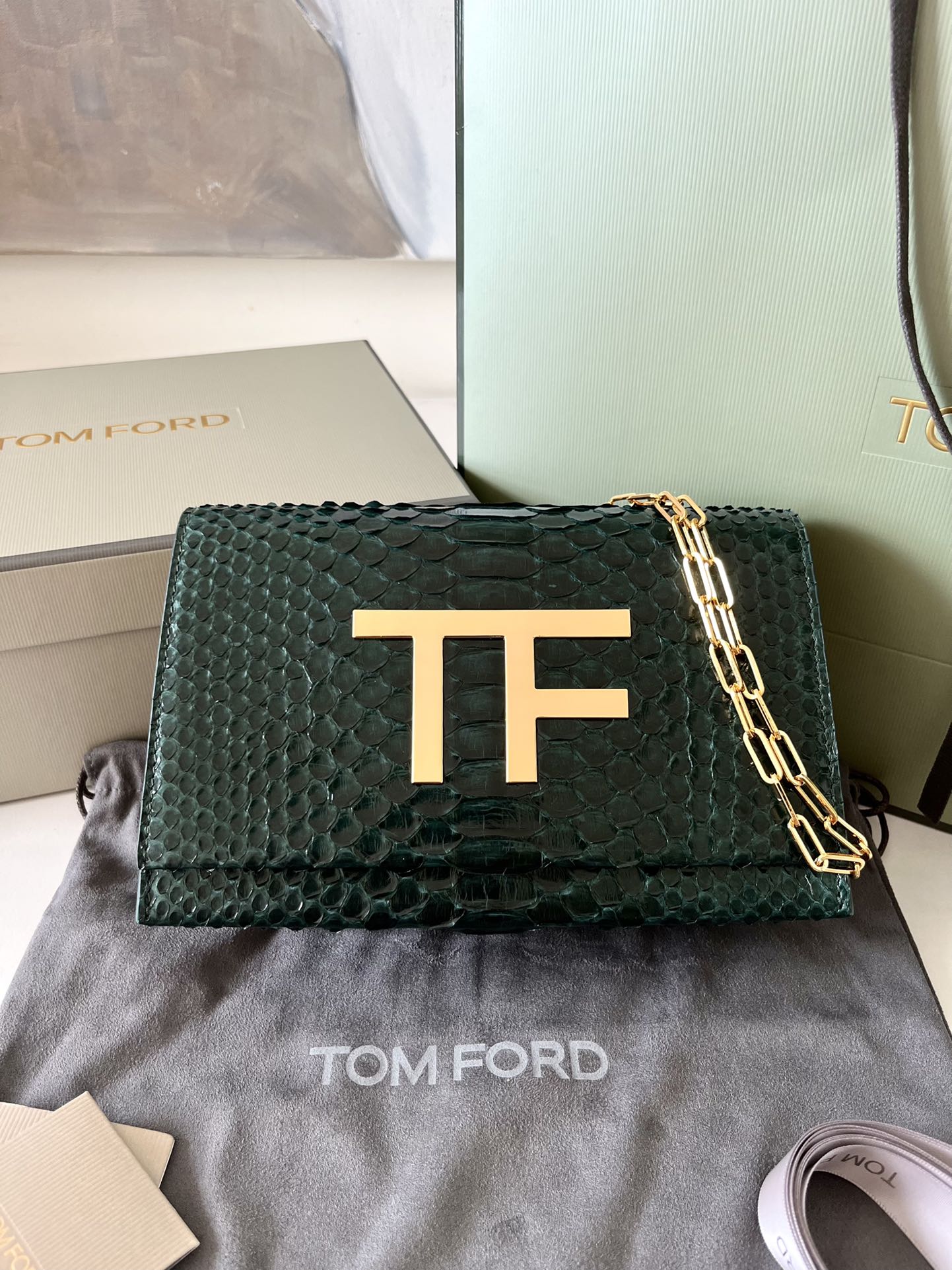 • Signature oversized TF gold-tone logo displayed prominently on the front flap