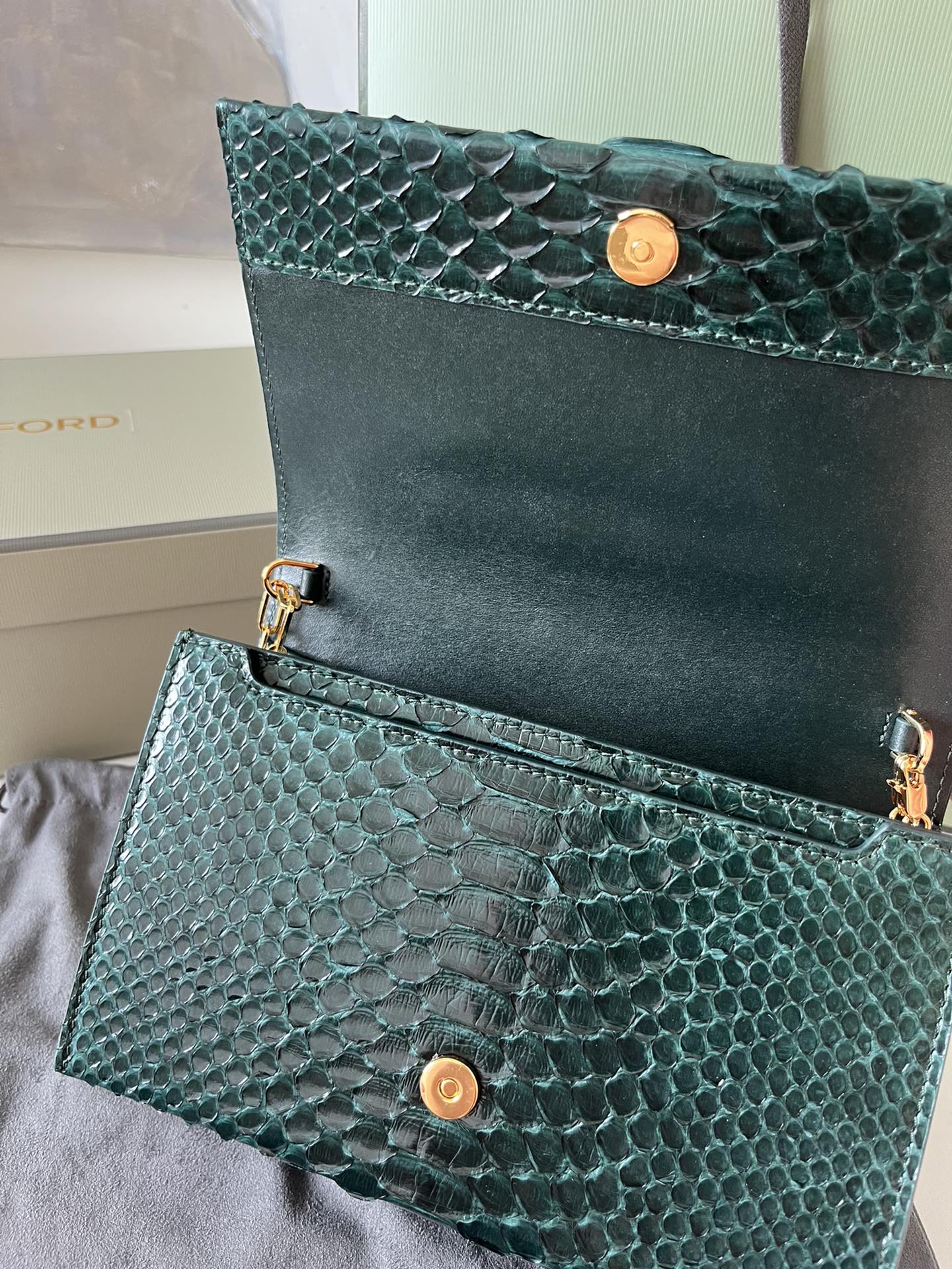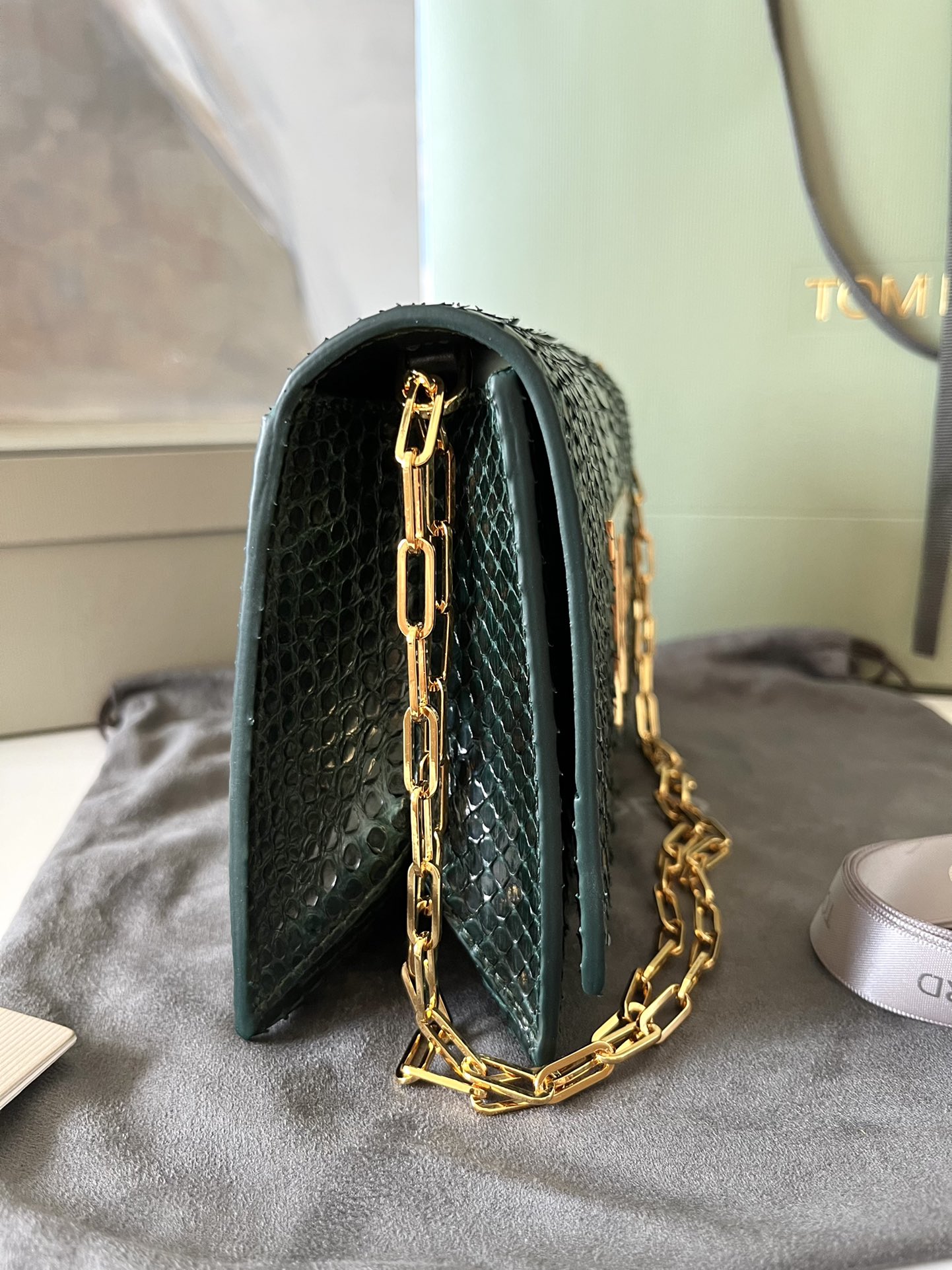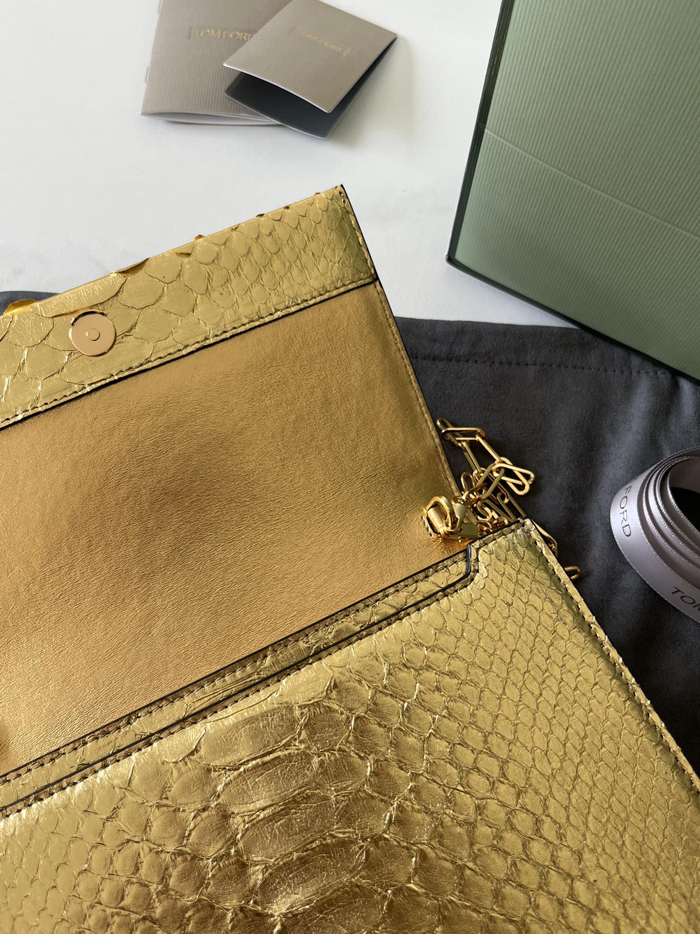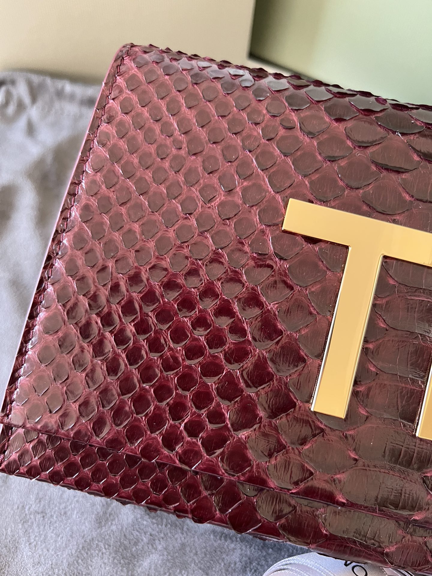 • Signature oversized TF gold-tone logo displayed prominently on the front flap