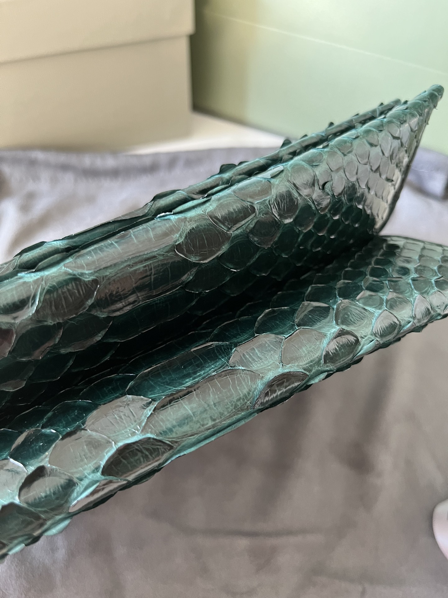 • Crafted from premium python-embossed leather with a high-shine, mirrored finish
