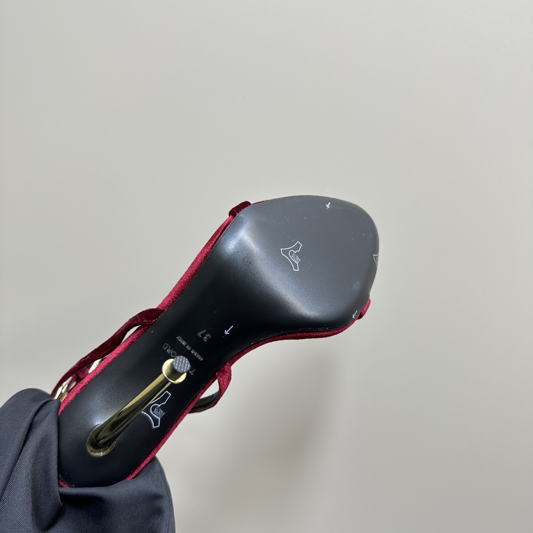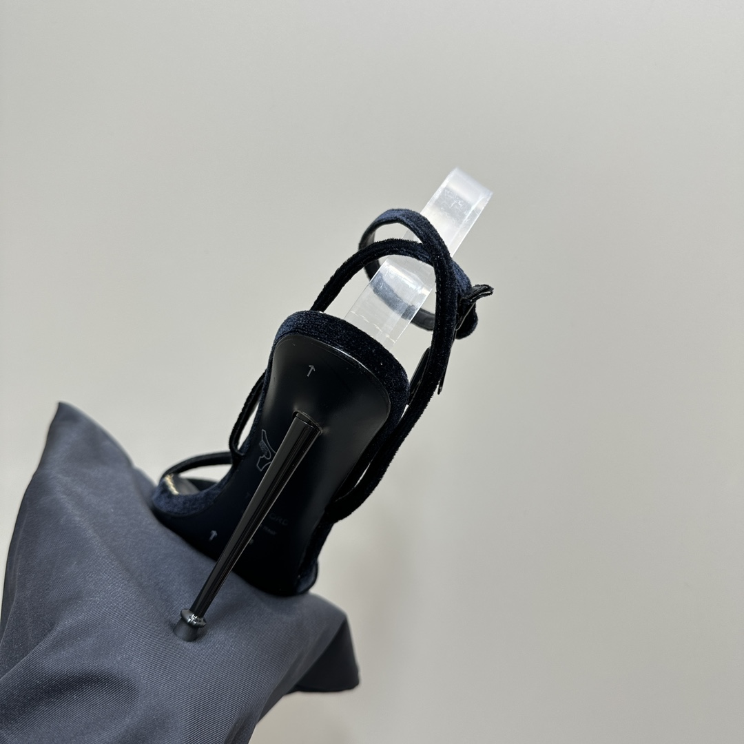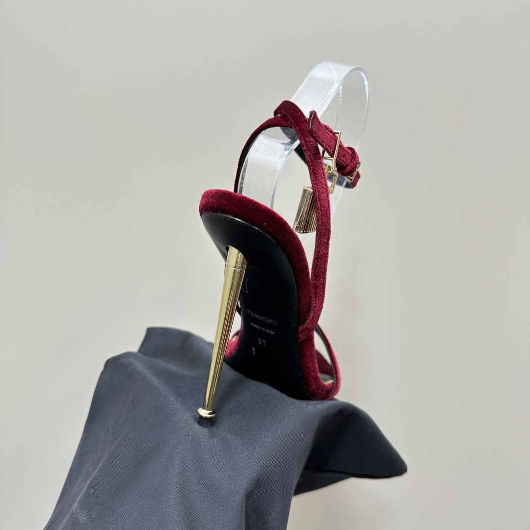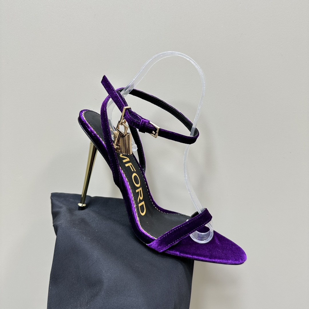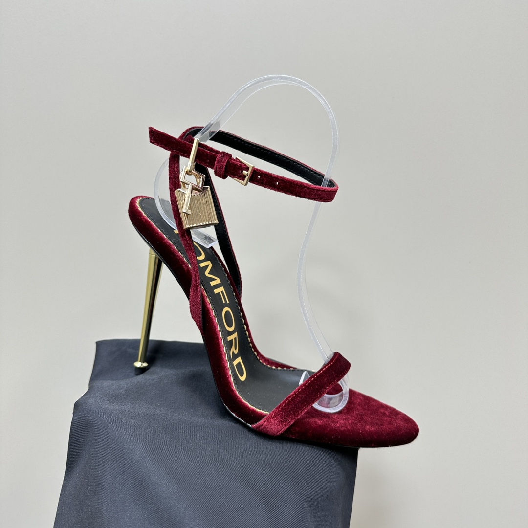 The Tom Ford Velvet Padlock Sandals are a perfect expression of luxury and sensuality. Crafted in plush velvet, these sandals feature a sleek pointed open-toe design, a slim ankle strap, and Tom Ford’s signature gold stiletto heel adorned with the iconic padlock and key charm — a symbol of refined power and timeless seduction.