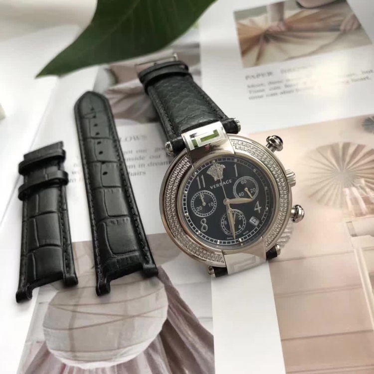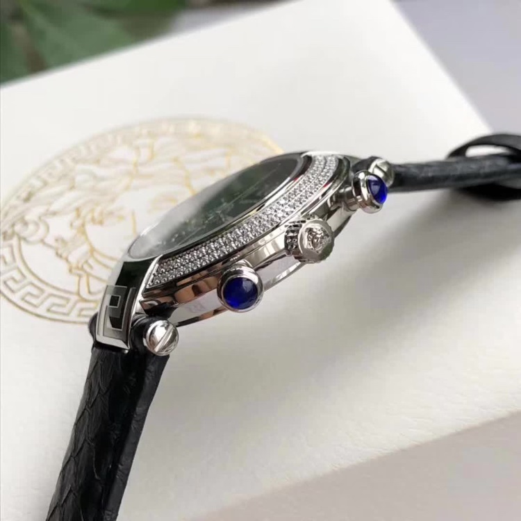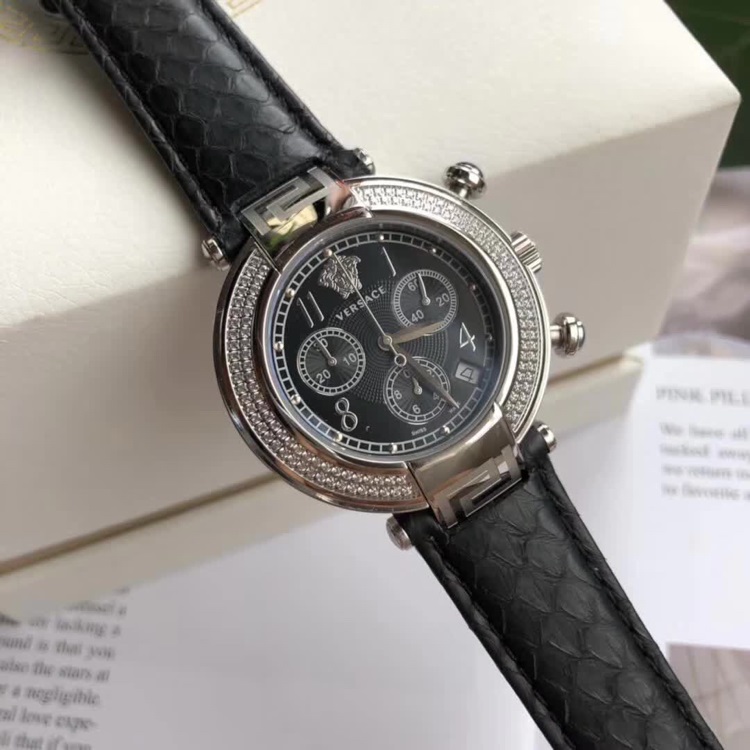 ✨ This watch blends Versace’s signature elegance with a sporty chronograph layout. The gold-tone casing with diamond embellishment adds luxury, while the white leather strap makes it versatile for formal or upscale casual wear.