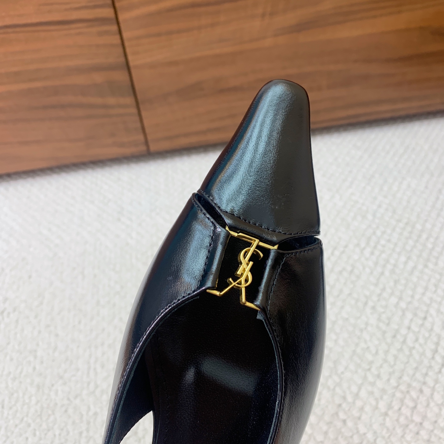 Logo Detail: Signature gold-tone YSL monogram centered on the vamp