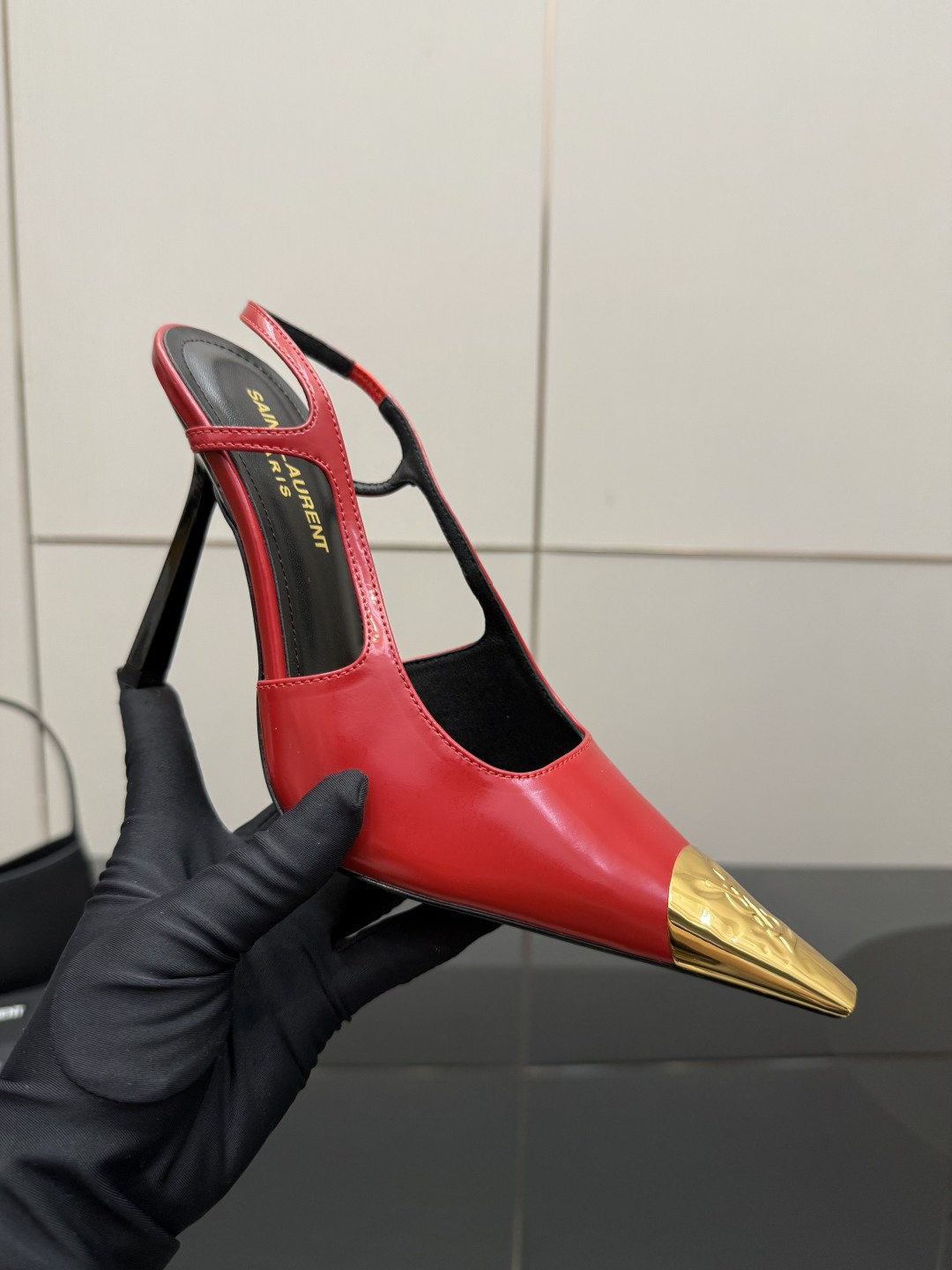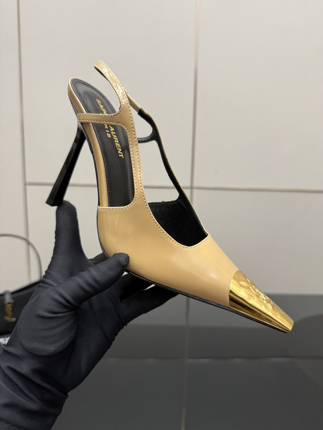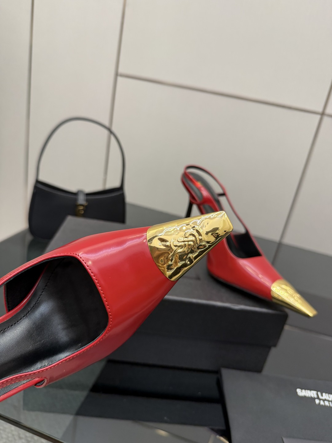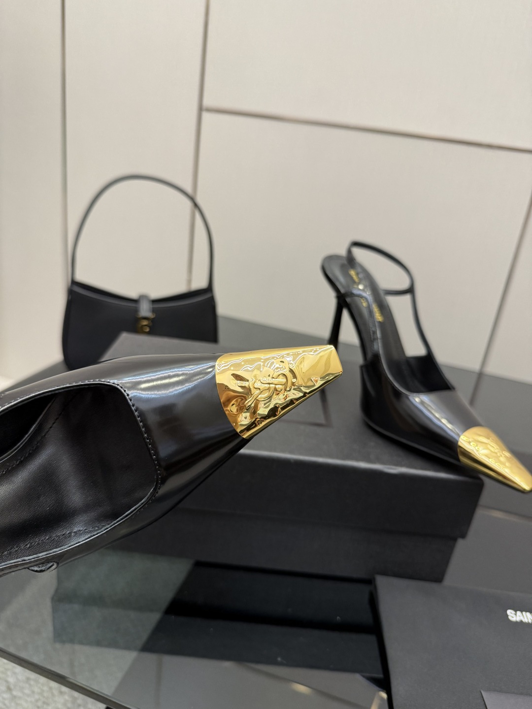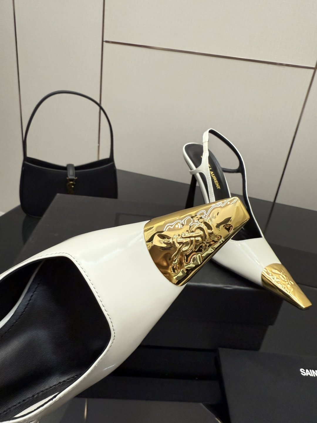 - Polished gold metal toe cap delivers an iconic Saint Laurent couture touch