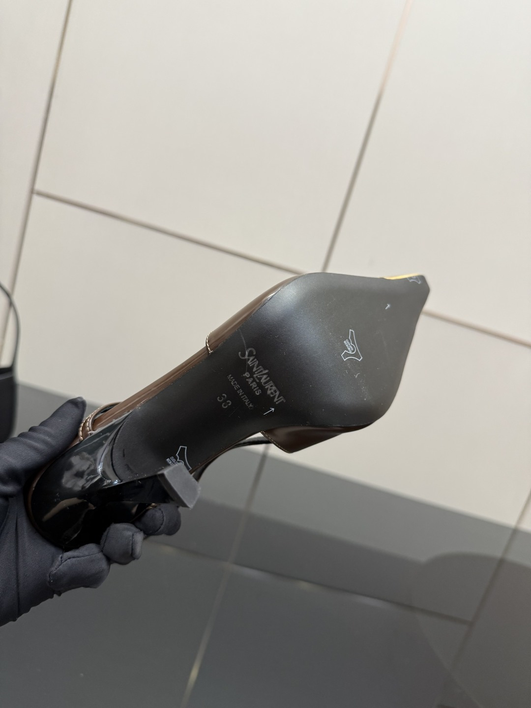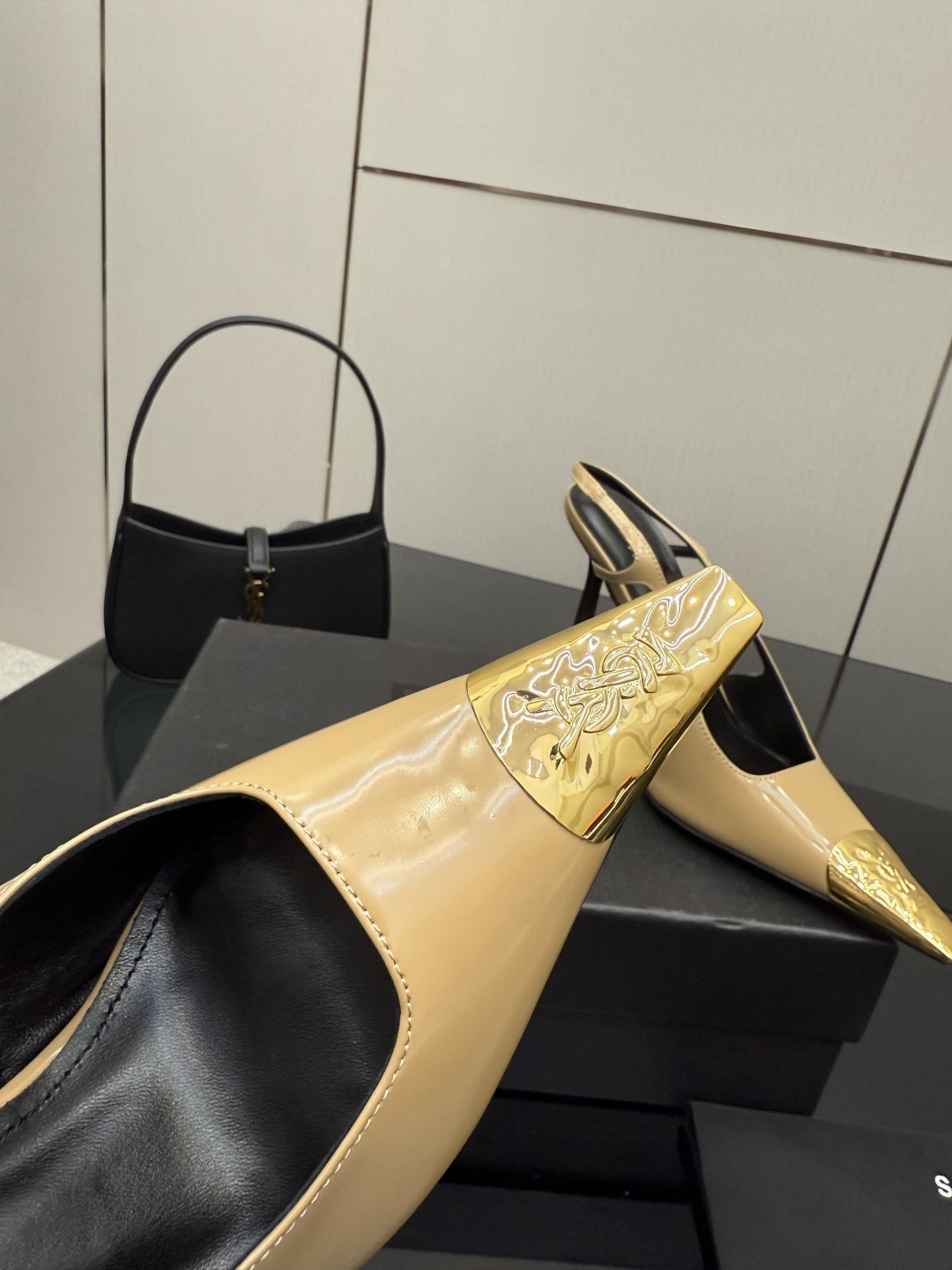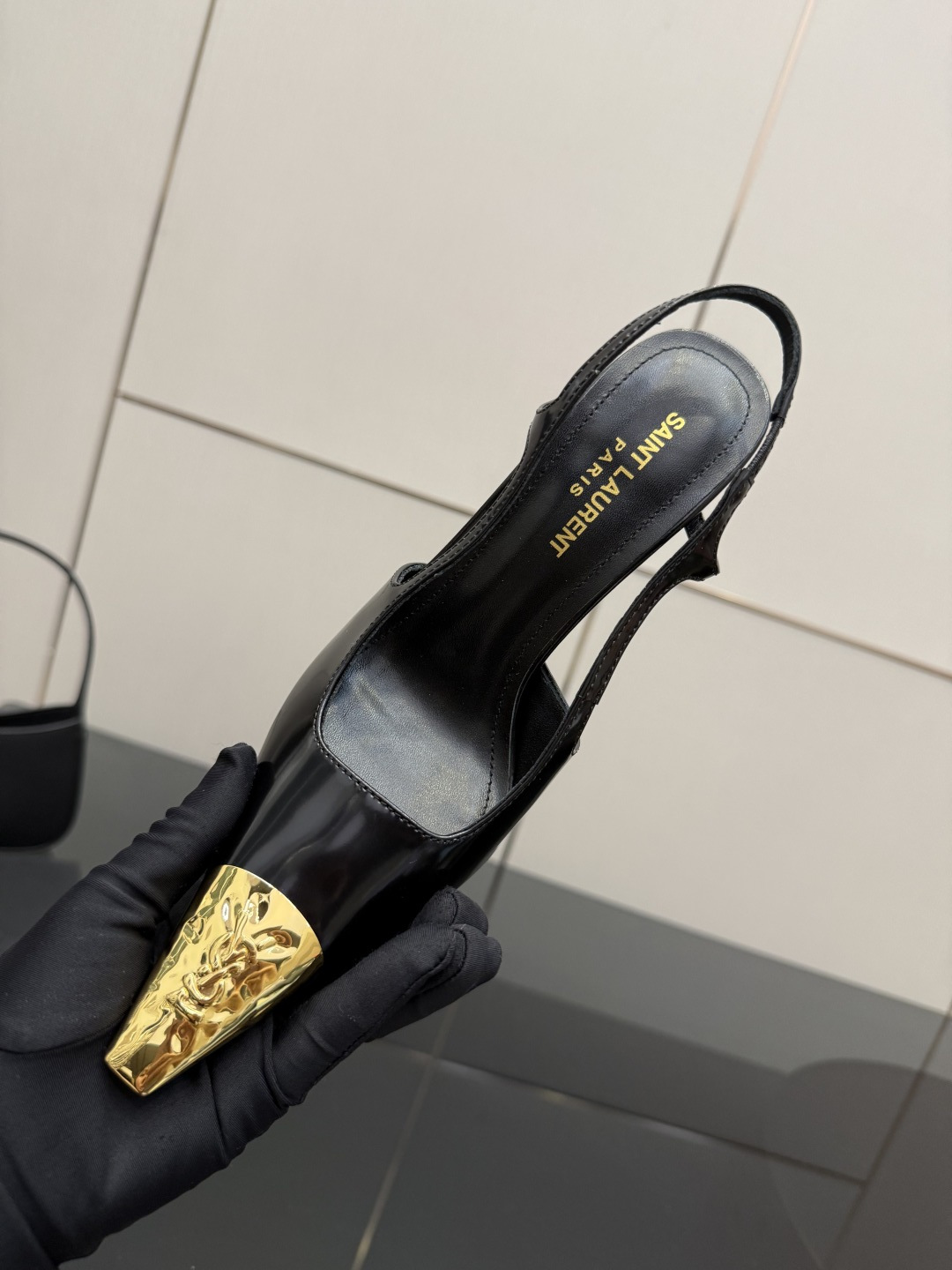 Logo Detail: Sculpted gold-tone metal cap toe featuring engraved YSL monogram