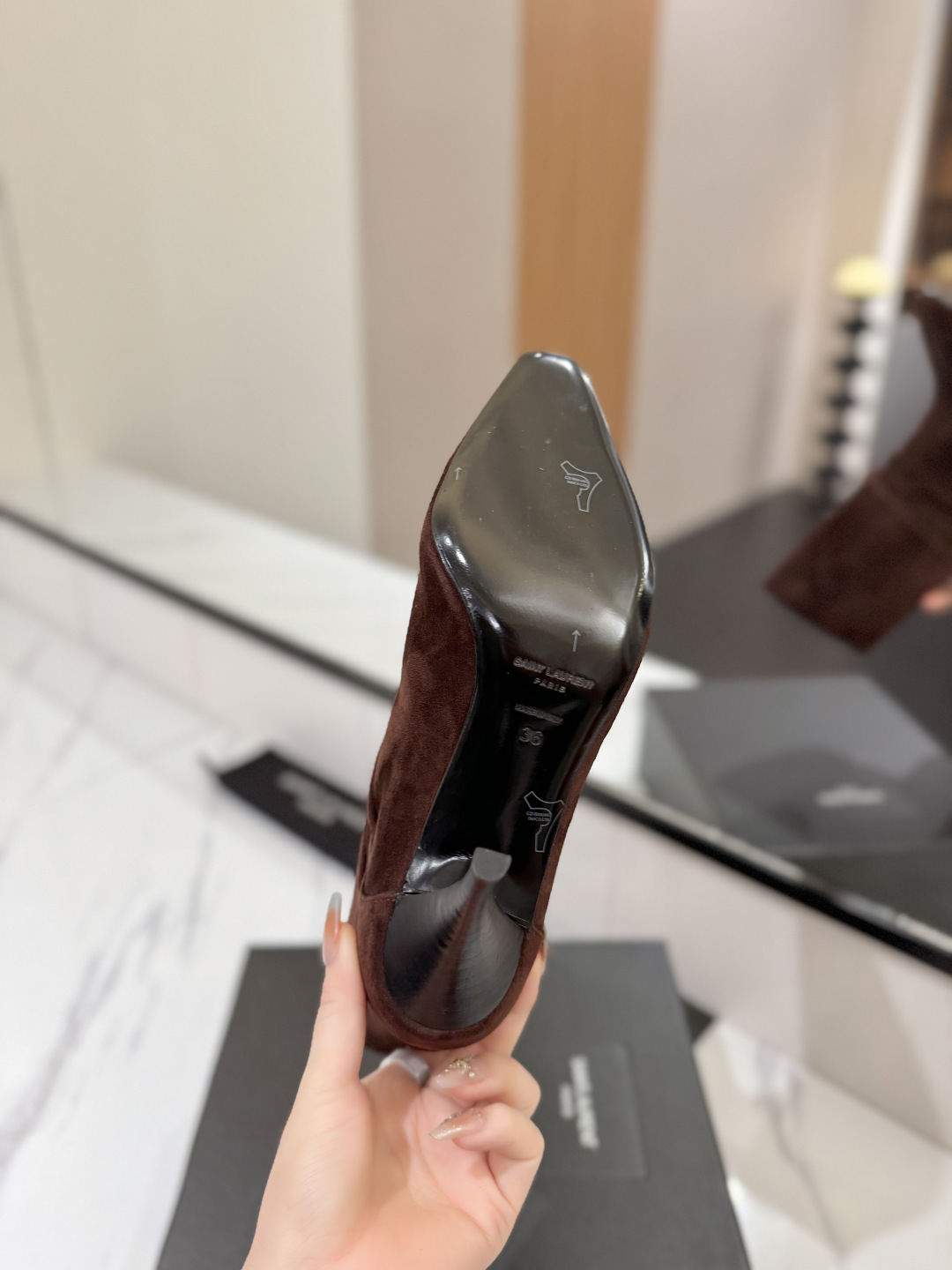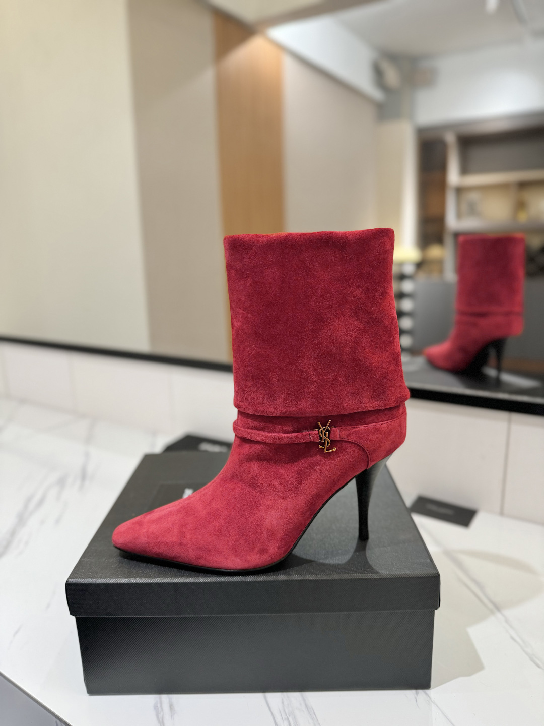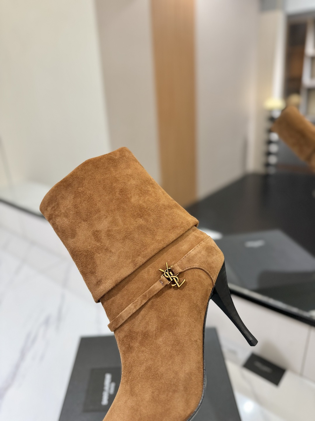 Logo Detail: Discreet gold-tone YSL monogram charm positioned at the side of the ankle